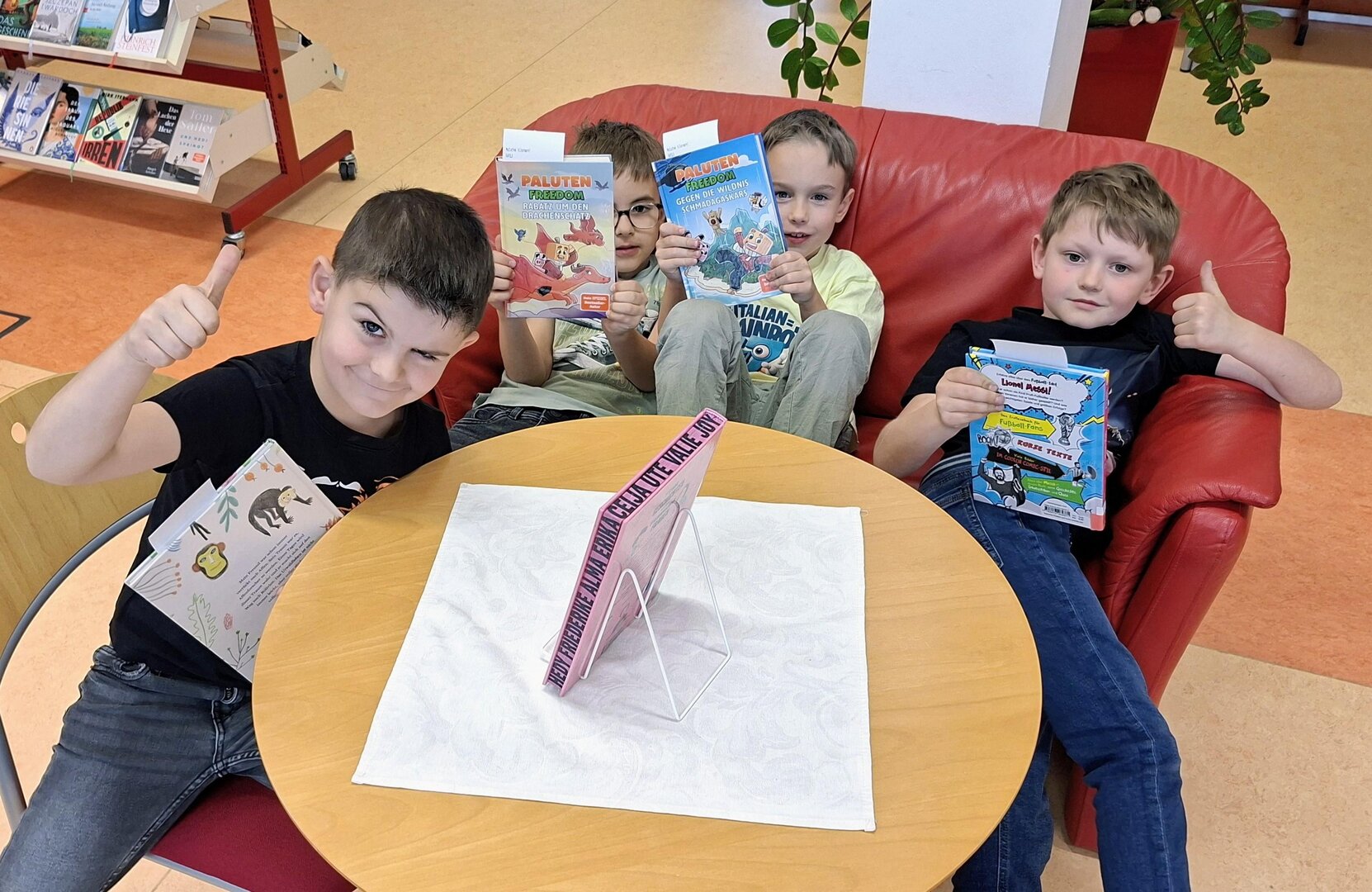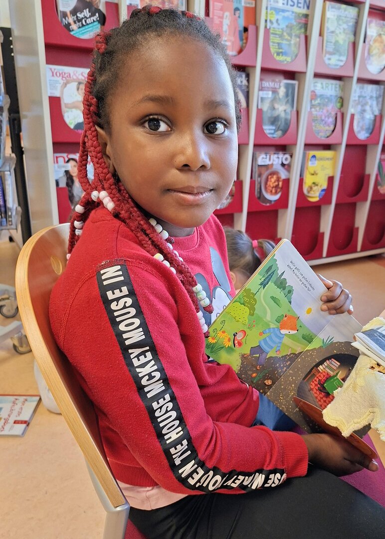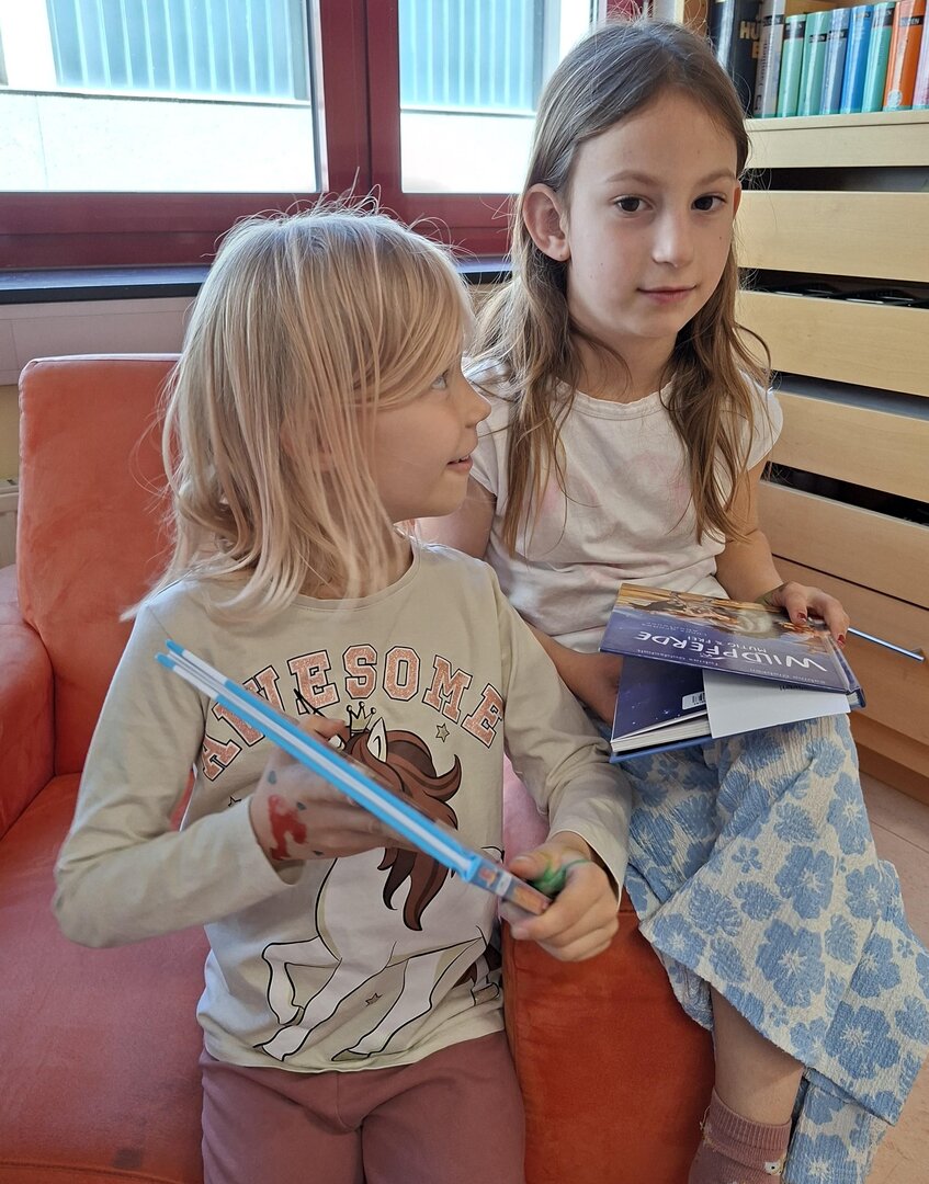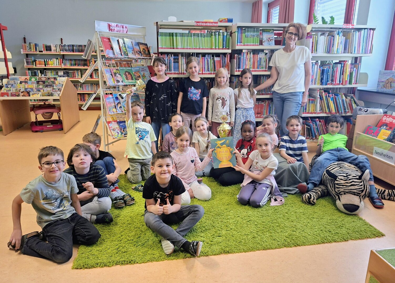 Die entzückenden Kinder der 1A Klasse lesen schon prima und kommen immer gerne in die Mediathek. Leise suchen sie sich ein oder zwei Bücher aus und beginnen meistens gleich darin zu lesen. Heute wurde ihnen vorher das Buch "Ein Pokal für den Schakal" vorgestellt. Der Schakal möchte immer gewinnen, und SEIN Pokal soll der größte und schönste sein. Überhaupt gebühren ALLE Medaillen und Preise ihm, so denkt er.