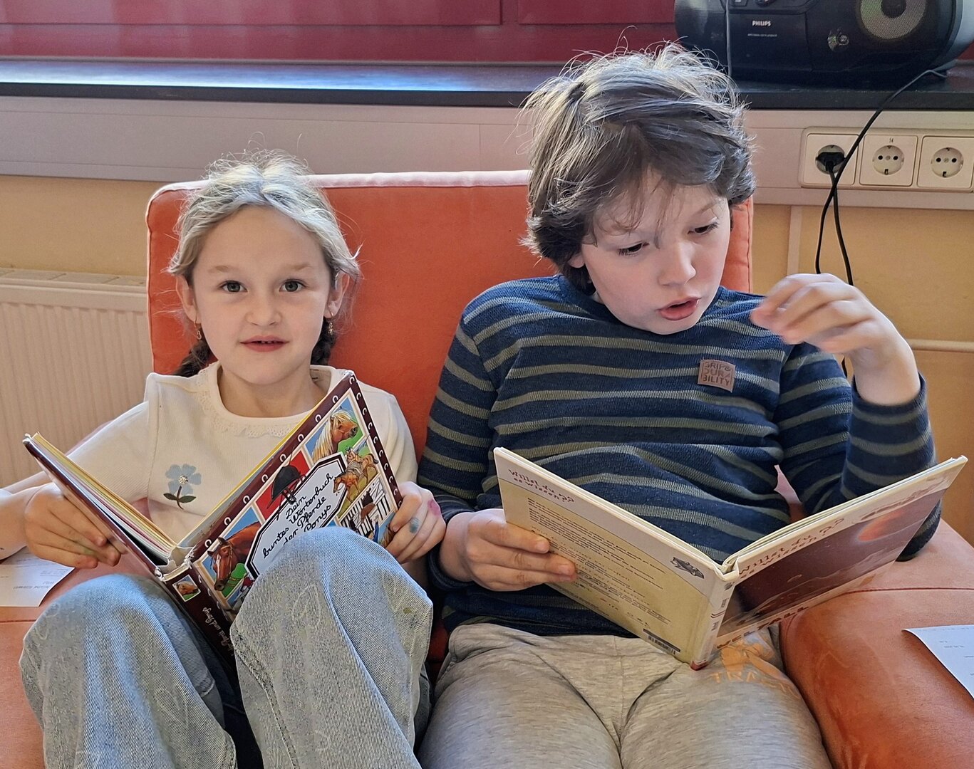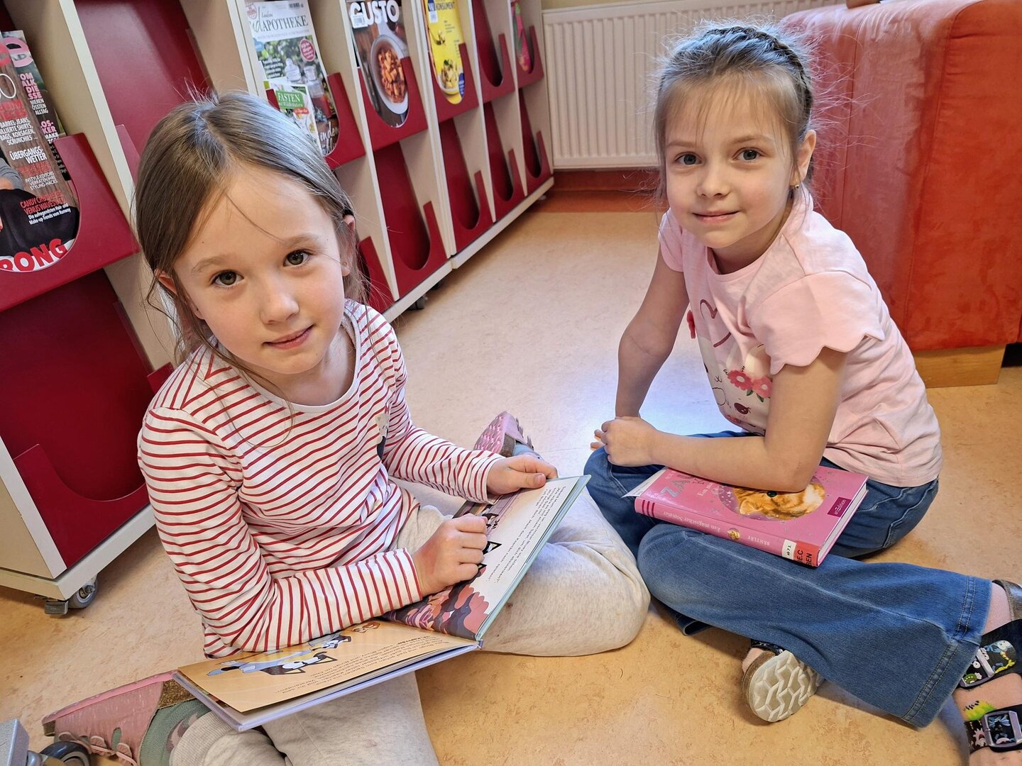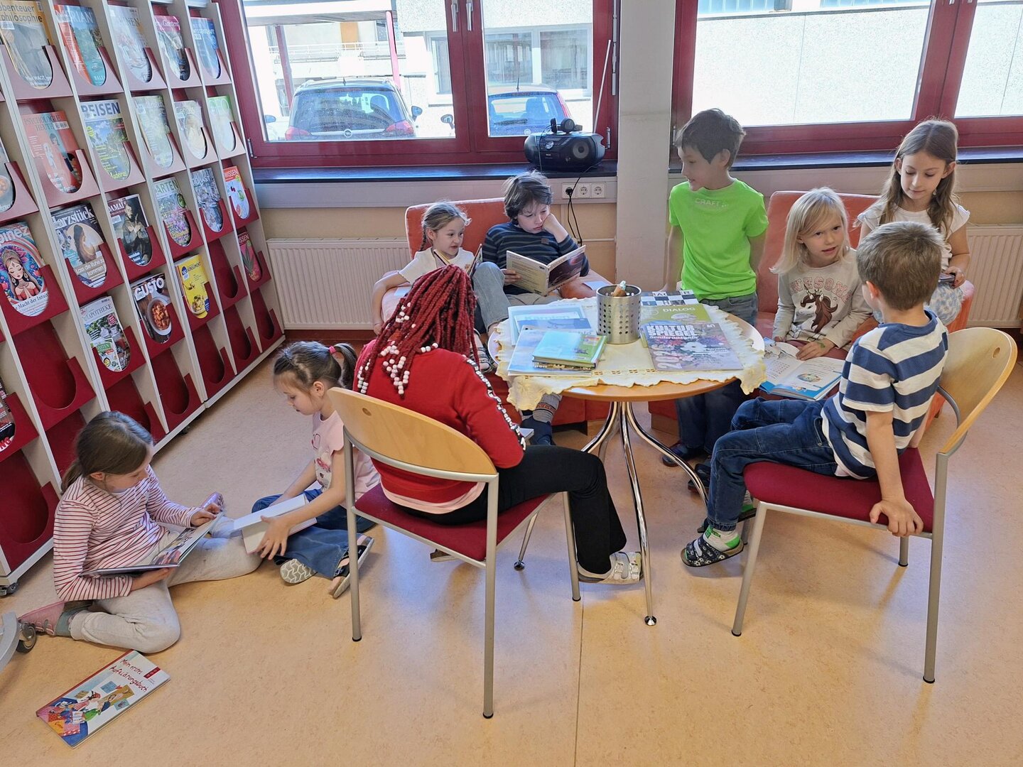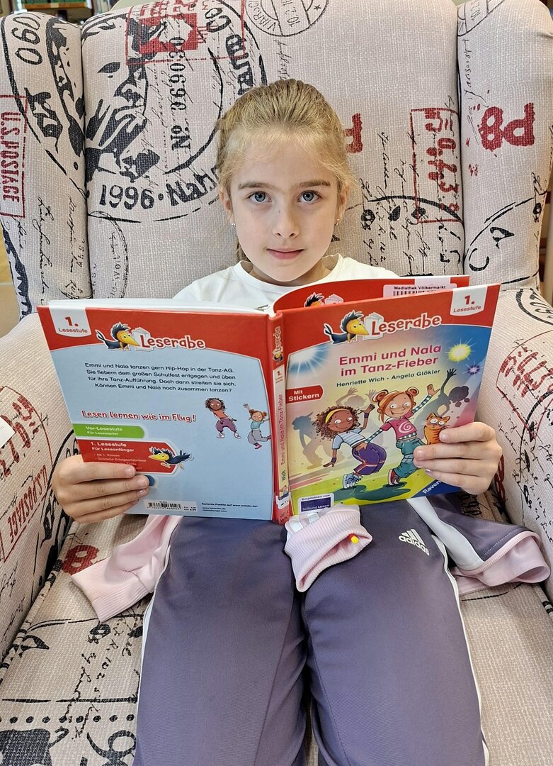 Die entzückenden Kinder der 1A Klasse lesen schon prima und kommen immer gerne in die Mediathek. Leise suchen sie sich ein oder zwei Bücher aus und beginnen meistens gleich darin zu lesen. Heute wurde ihnen vorher das Buch "Ein Pokal für den Schakal" vorgestellt. Der Schakal möchte immer gewinnen, und SEIN Pokal soll der größte und schönste sein. Überhaupt gebühren ALLE Medaillen und Preise ihm, so denkt er.