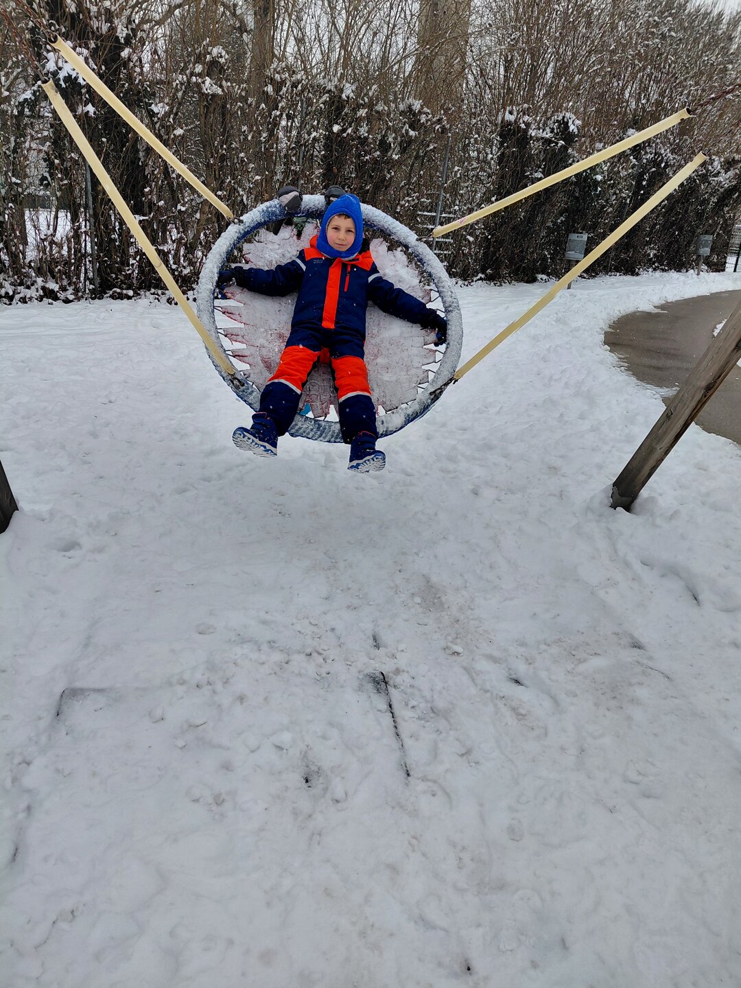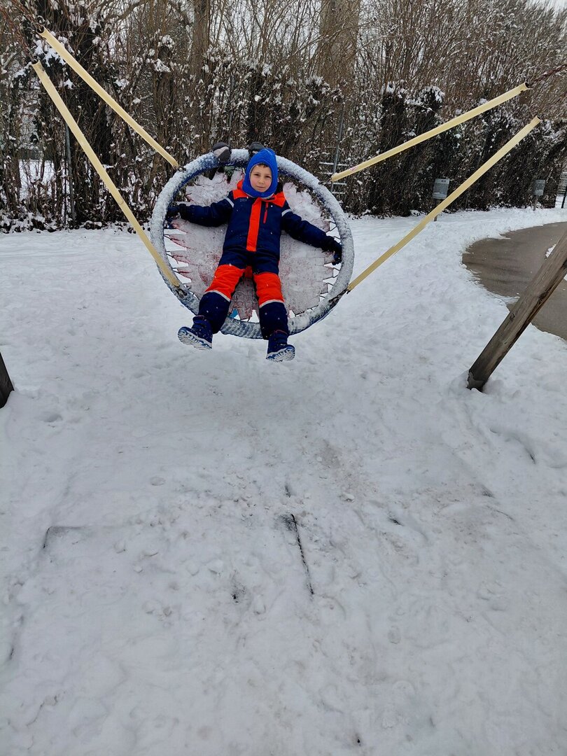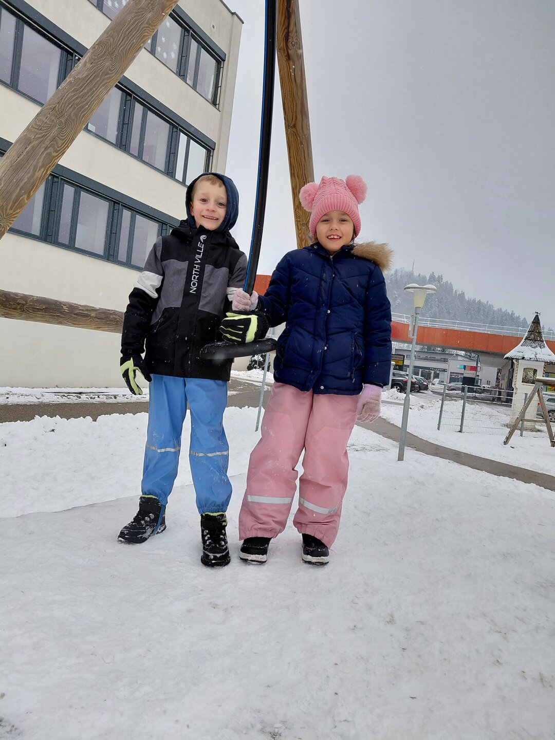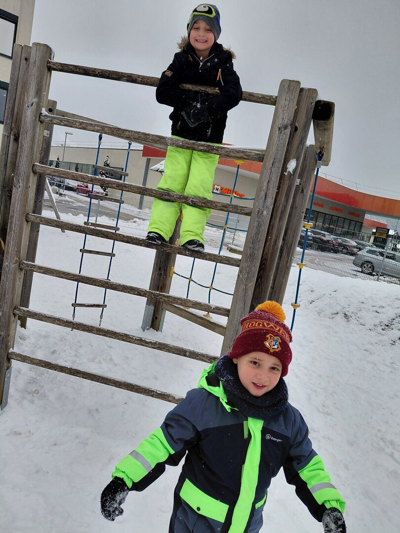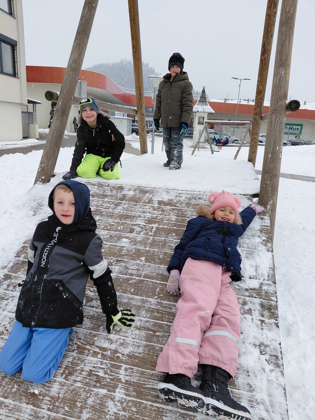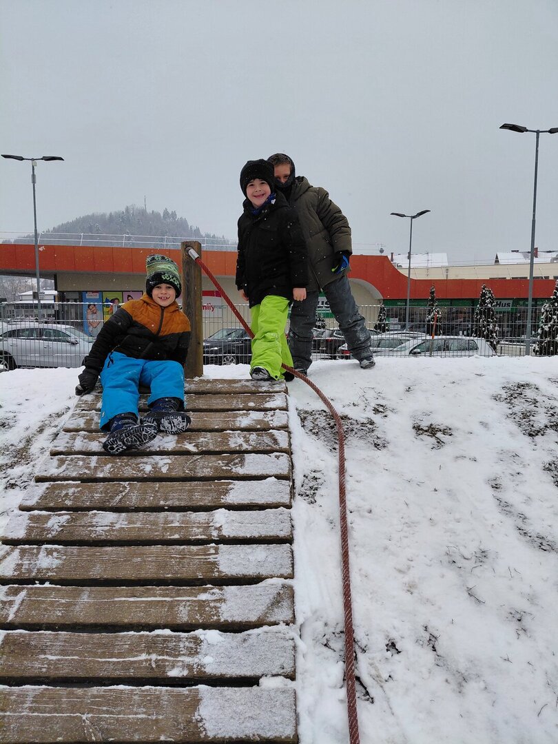 Wir verlegen unsere Turnstunde auf den Spielplatz und haben viel Spaß im Schnee.