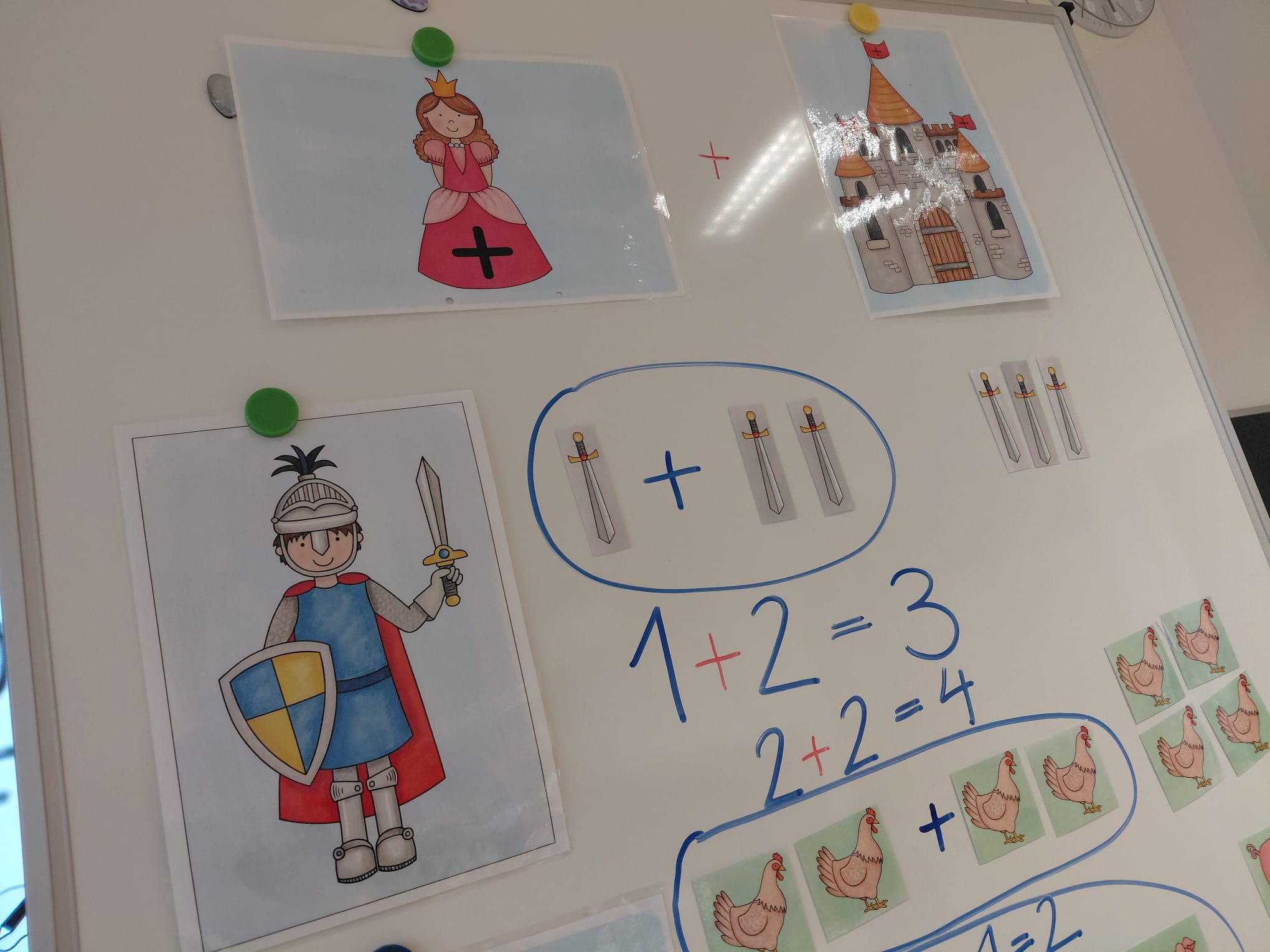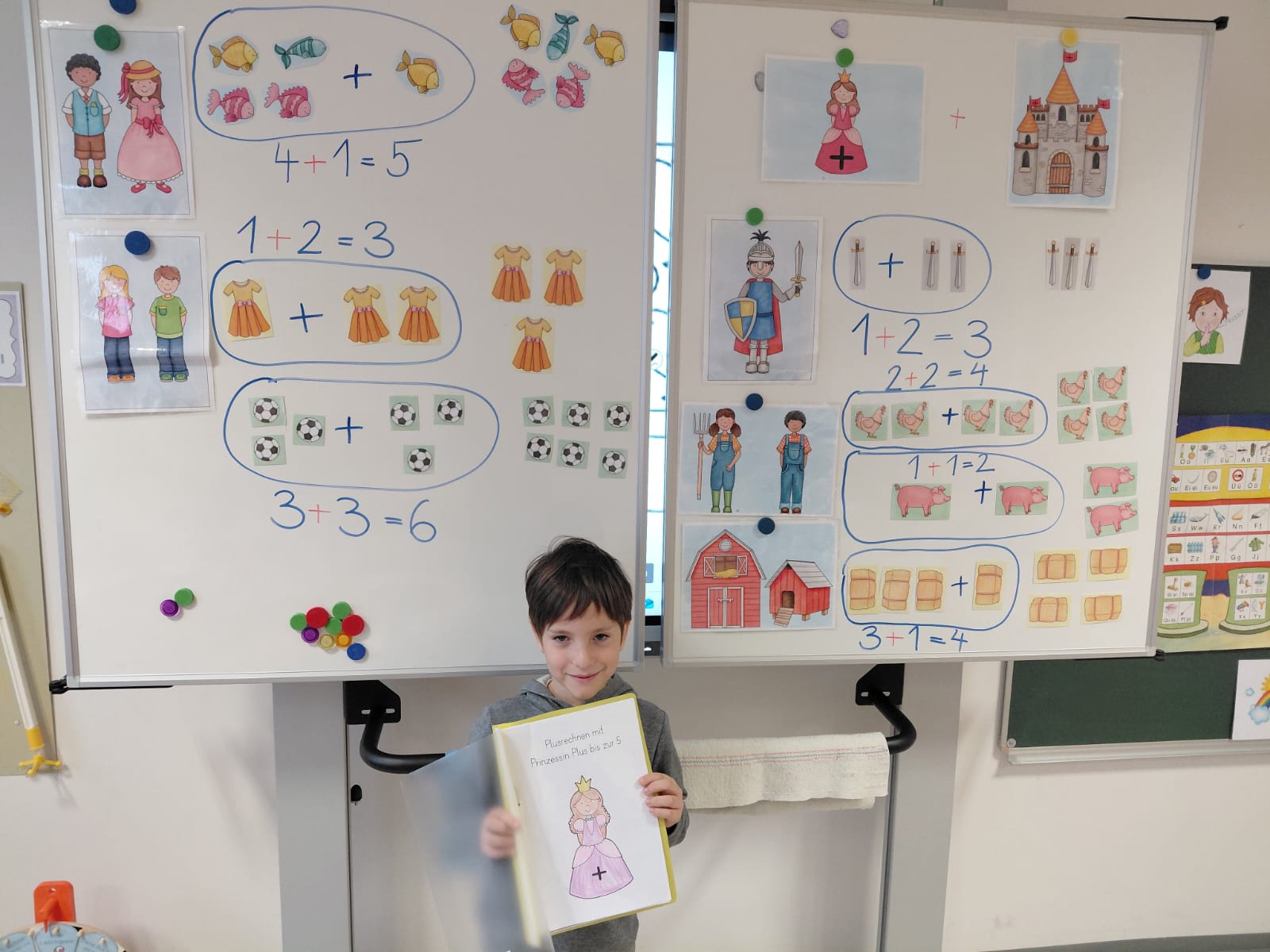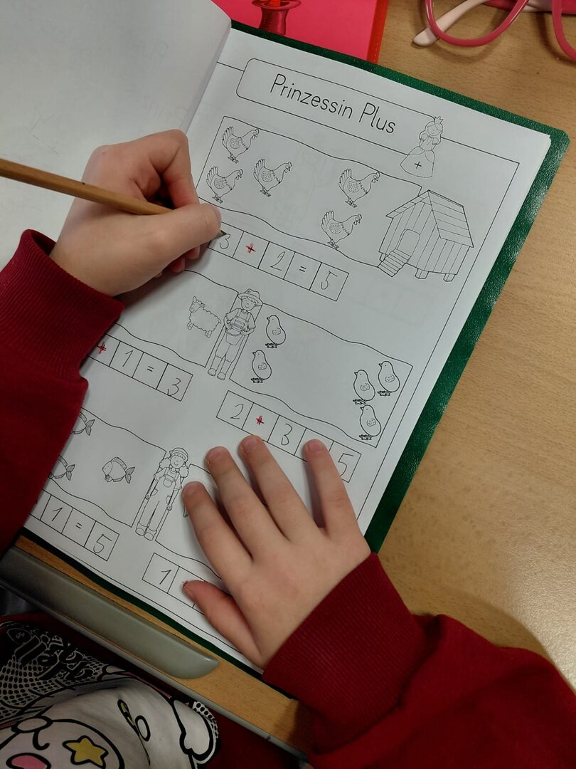 Die Kinder rechnen ihre ersten Additionsaufgaben.