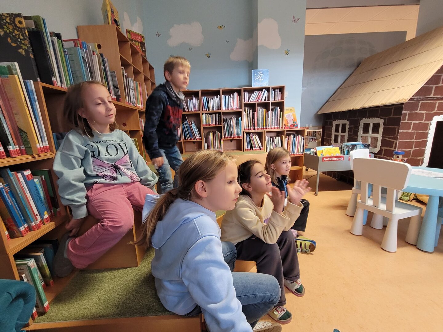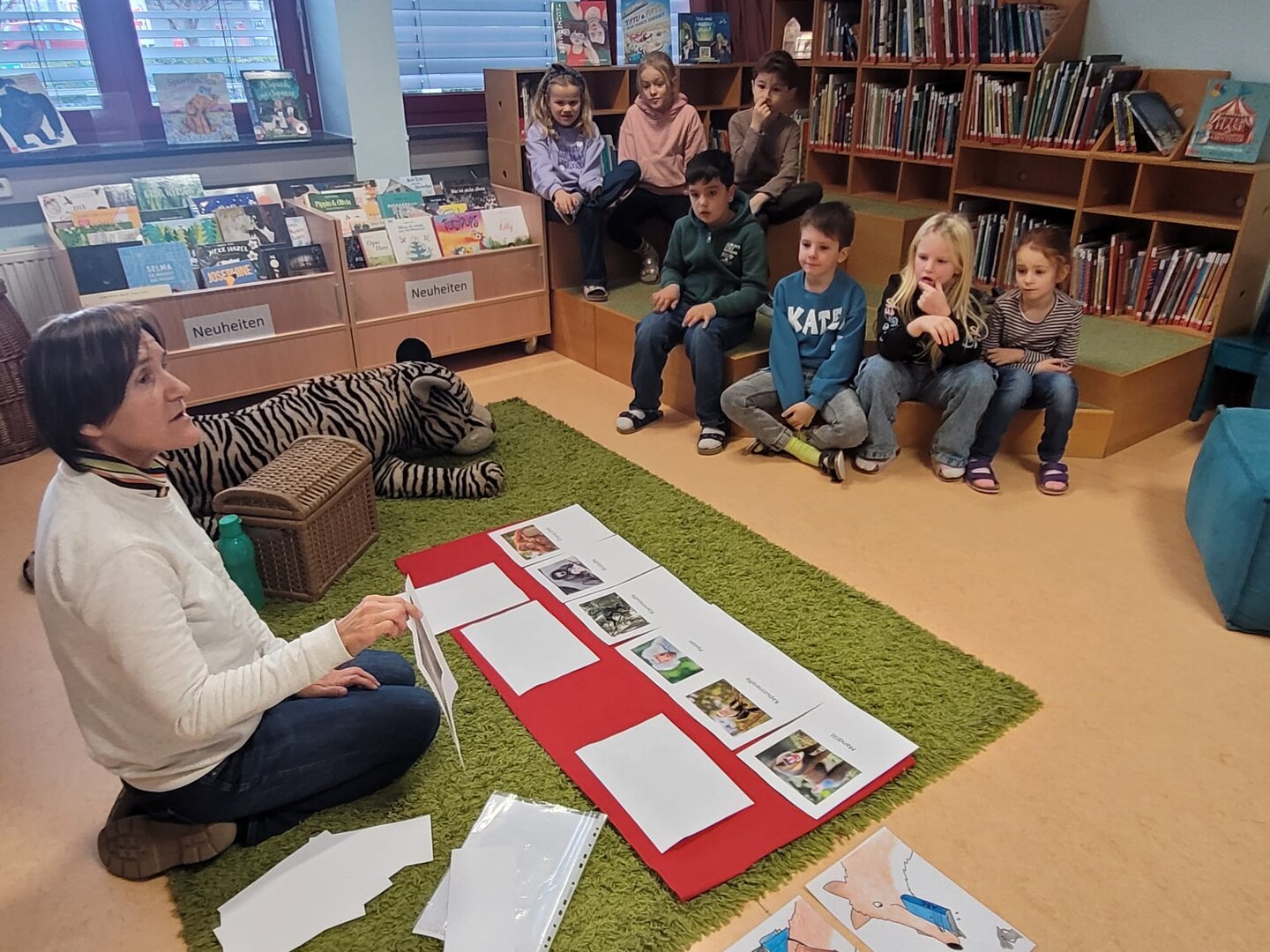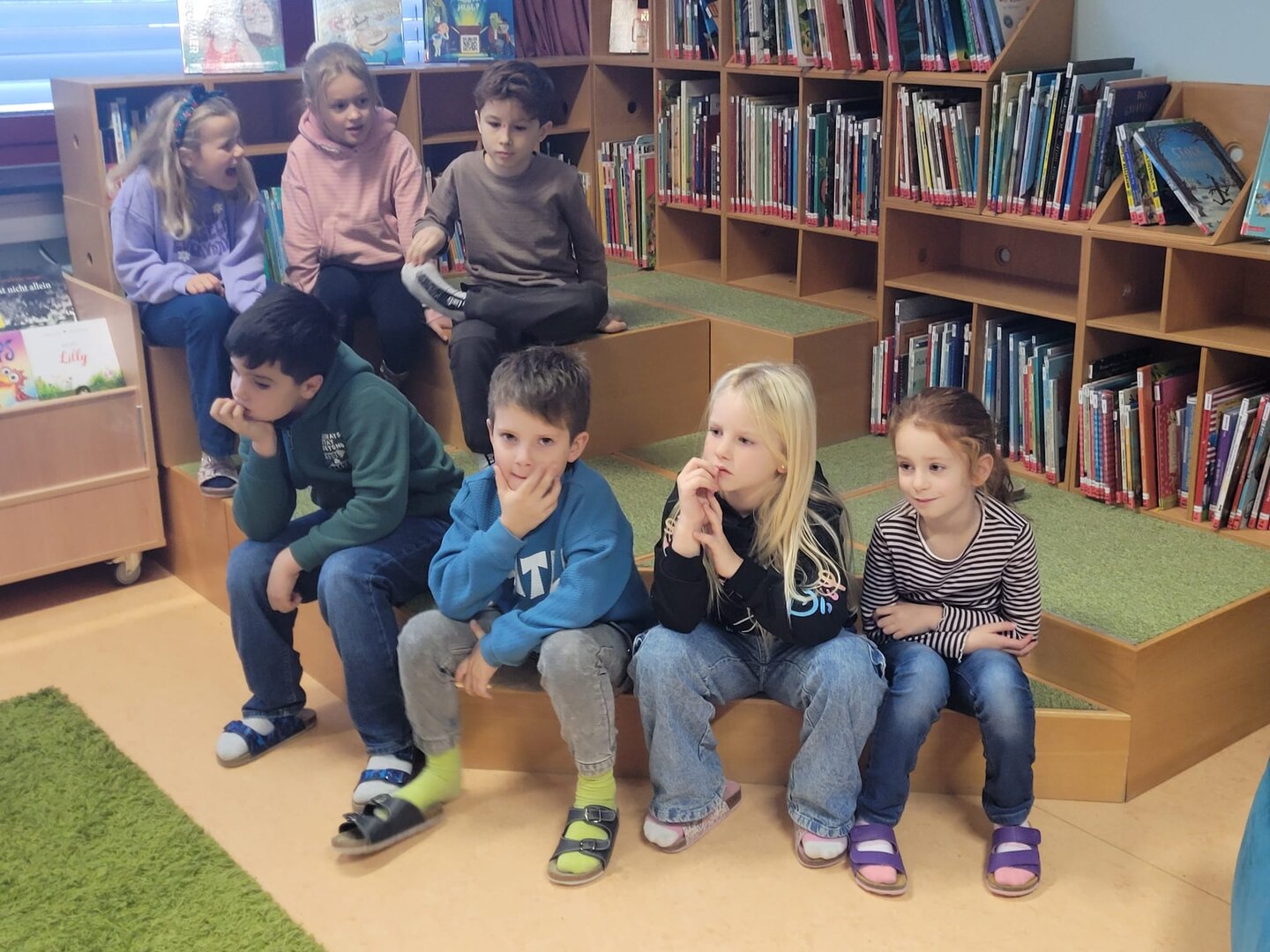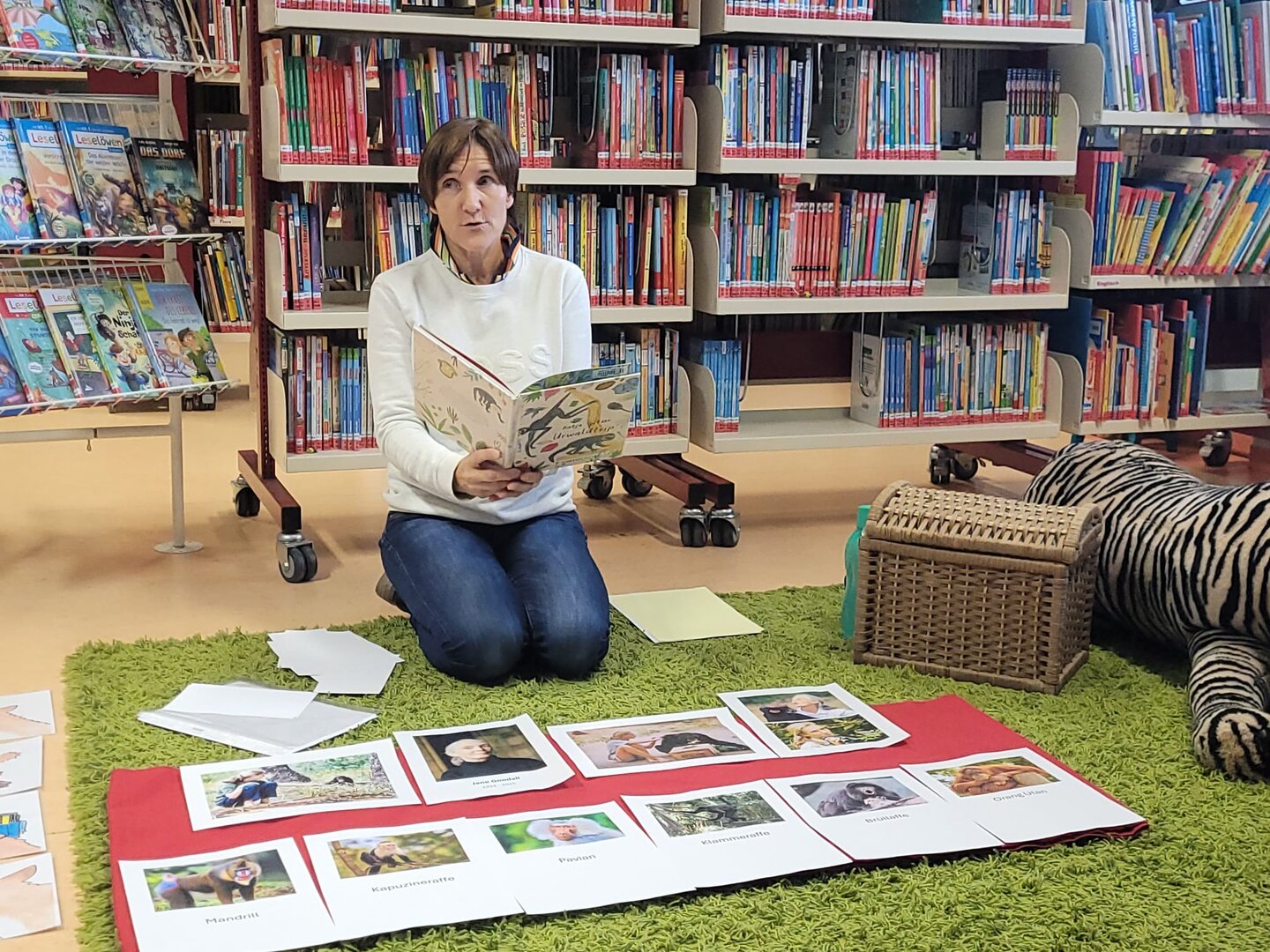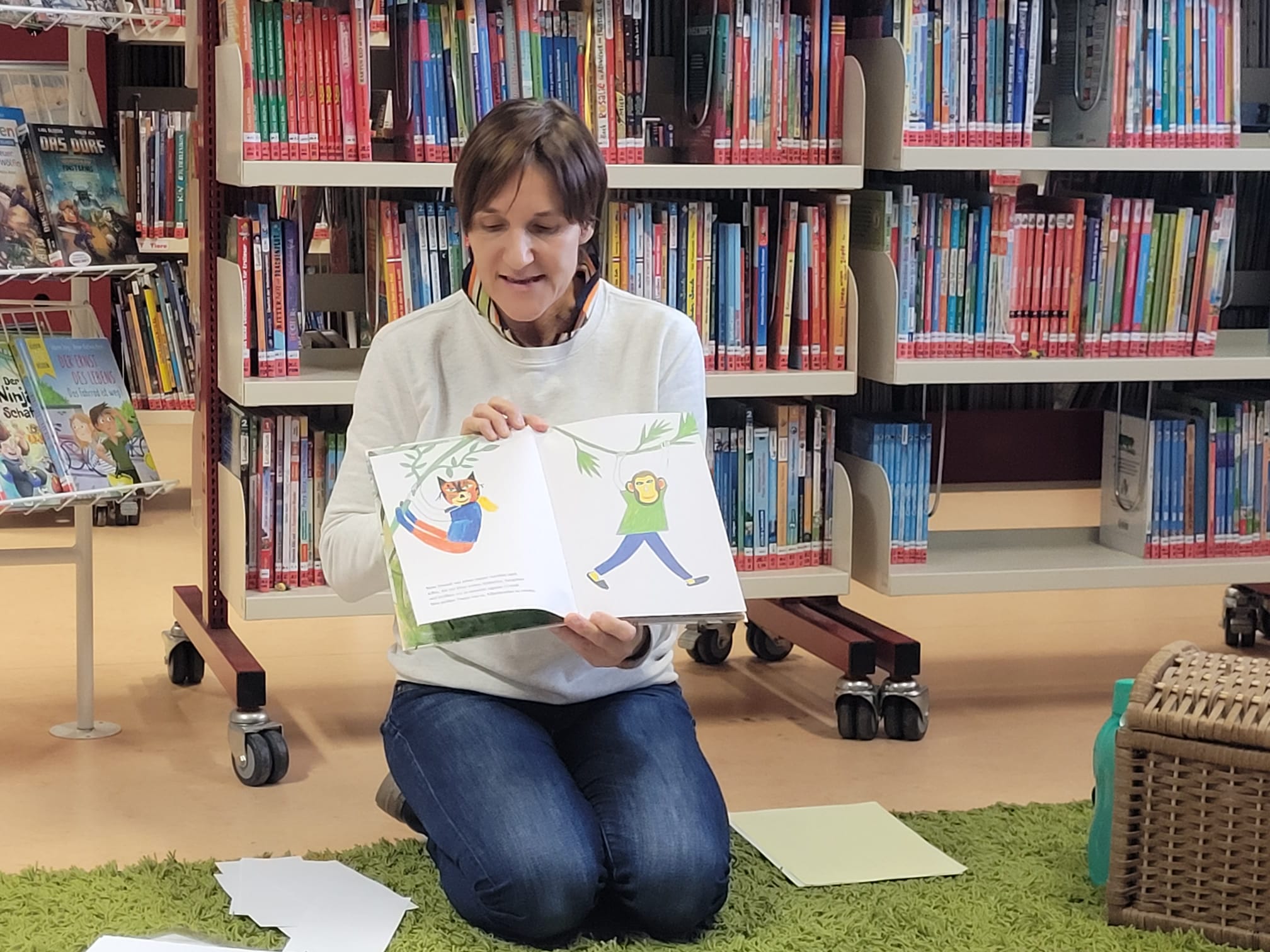 Die 2.B erlebte eine tolle Mediatheksstunde. Zuerst wurde Wissenswertes über Affen gelernt und aus dem Buch „Urwaldtrip“ vorgelesen. Danach blieb noch genug Zeit zum Schmökern und zum Ausleihen der Lieblingsbücher.