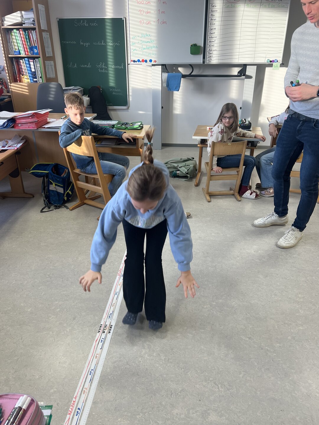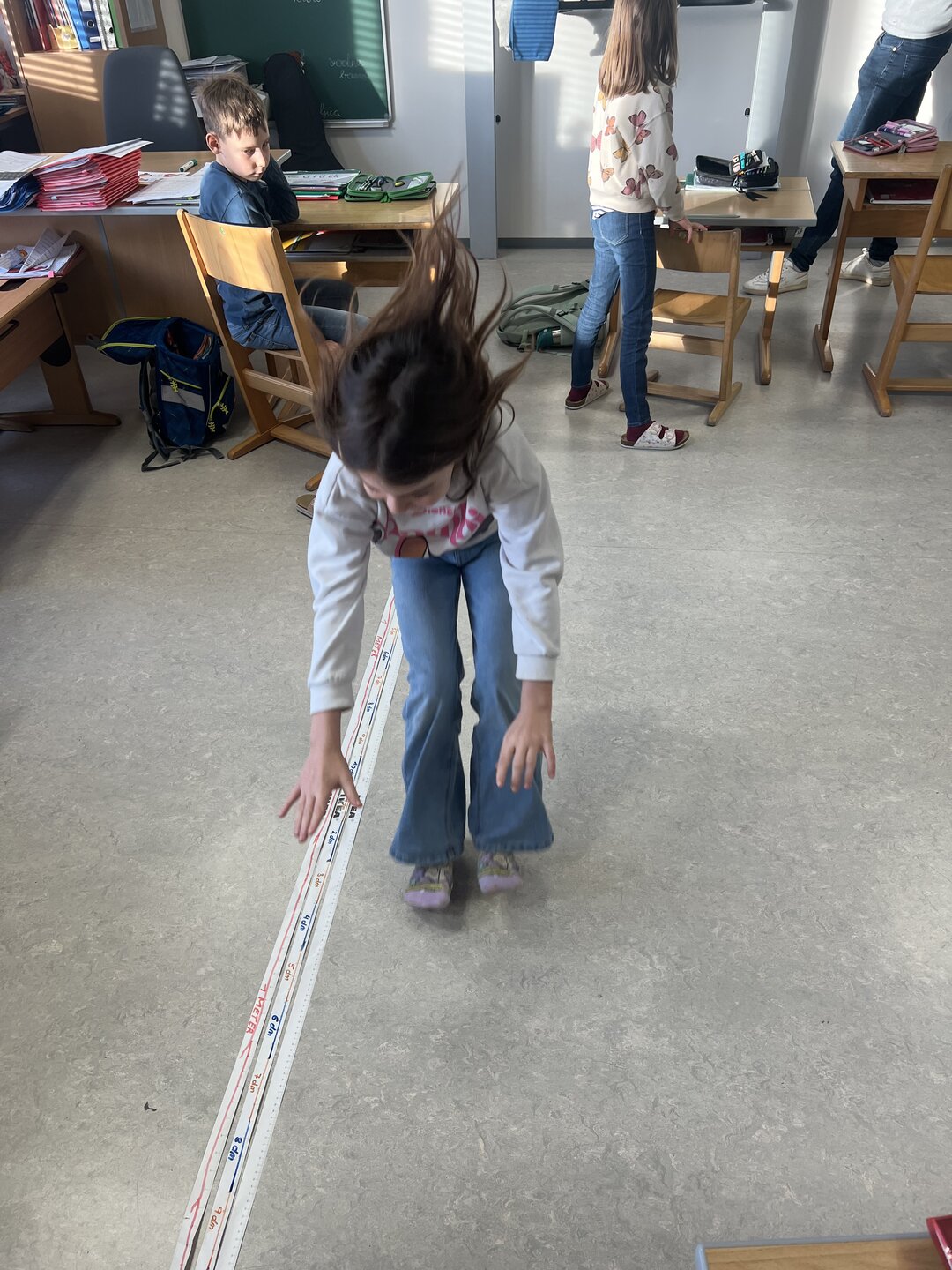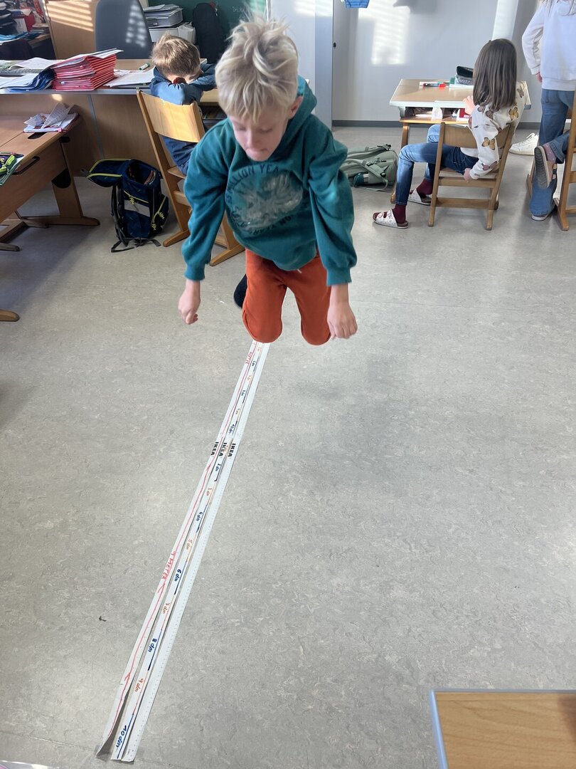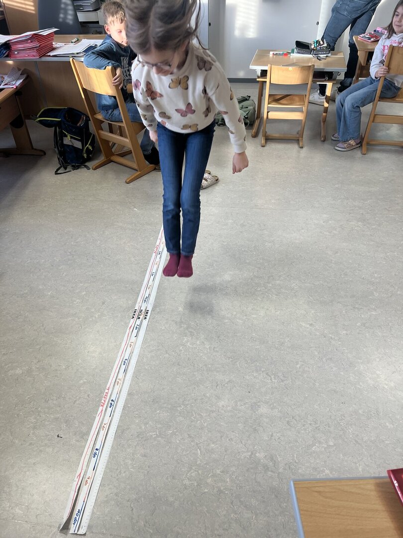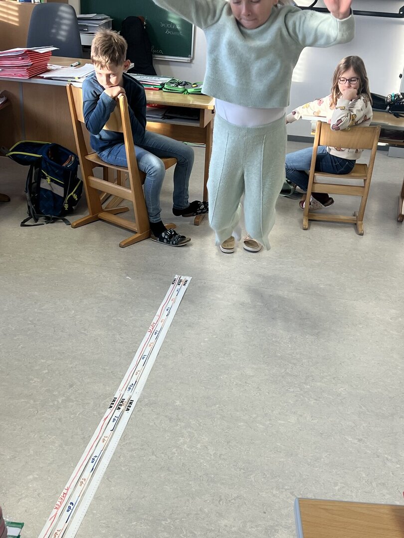 Beim Weitsprung in der Klasse haben die Kinder ihre Ergebnisse direkt selbst gemessen. Das war der perfekte Einstieg, um den Zusammenhang zwischen den verschiedenen Einheiten zu verstehen (Meter, Zentimeter, Millimeter)