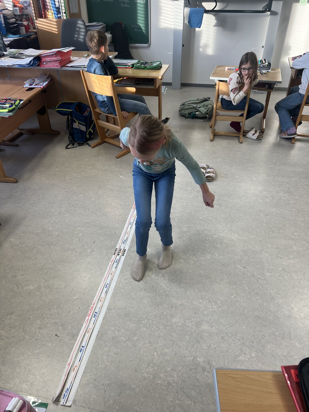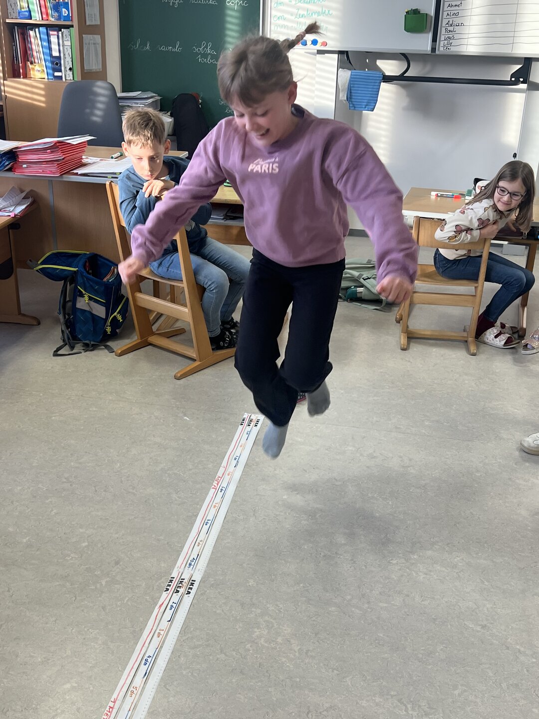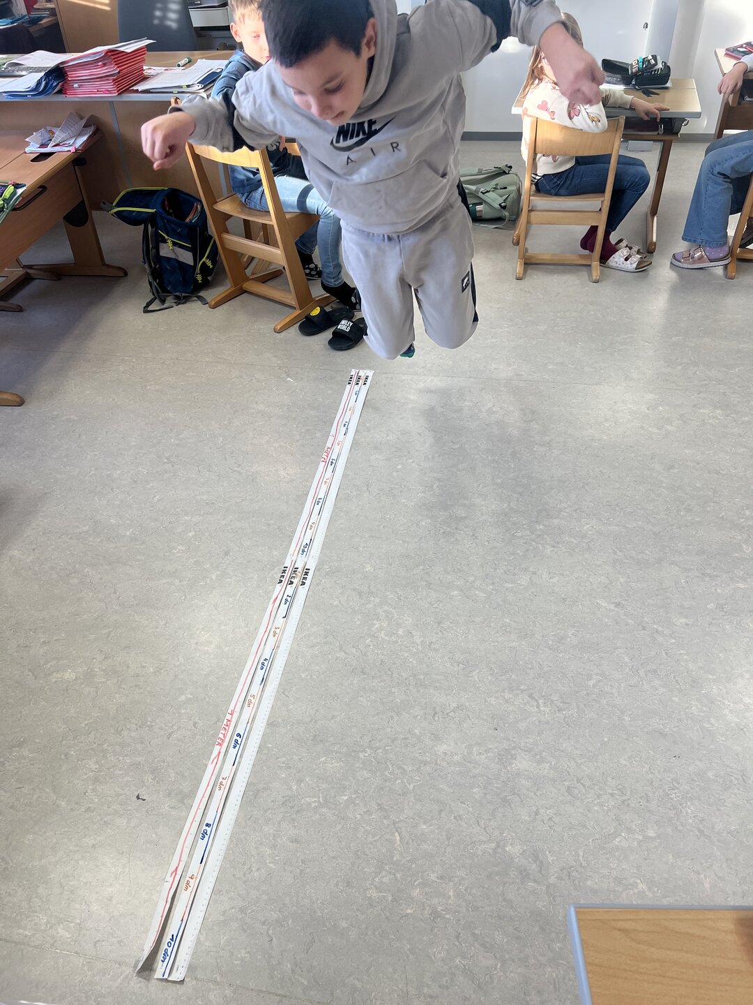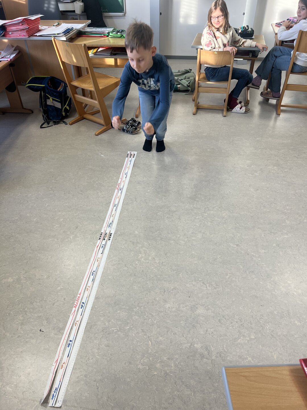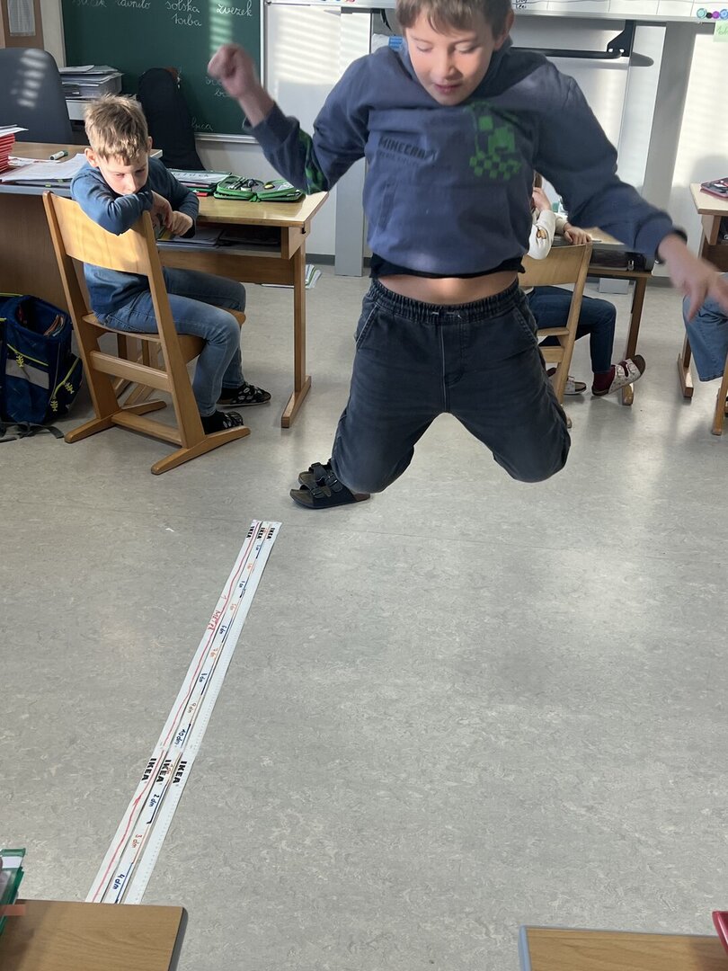 Beim Weitsprung in der Klasse haben die Kinder ihre Ergebnisse direkt selbst gemessen. Das war der perfekte Einstieg, um den Zusammenhang zwischen den verschiedenen Einheiten zu verstehen (Meter, Zentimeter, Millimeter)