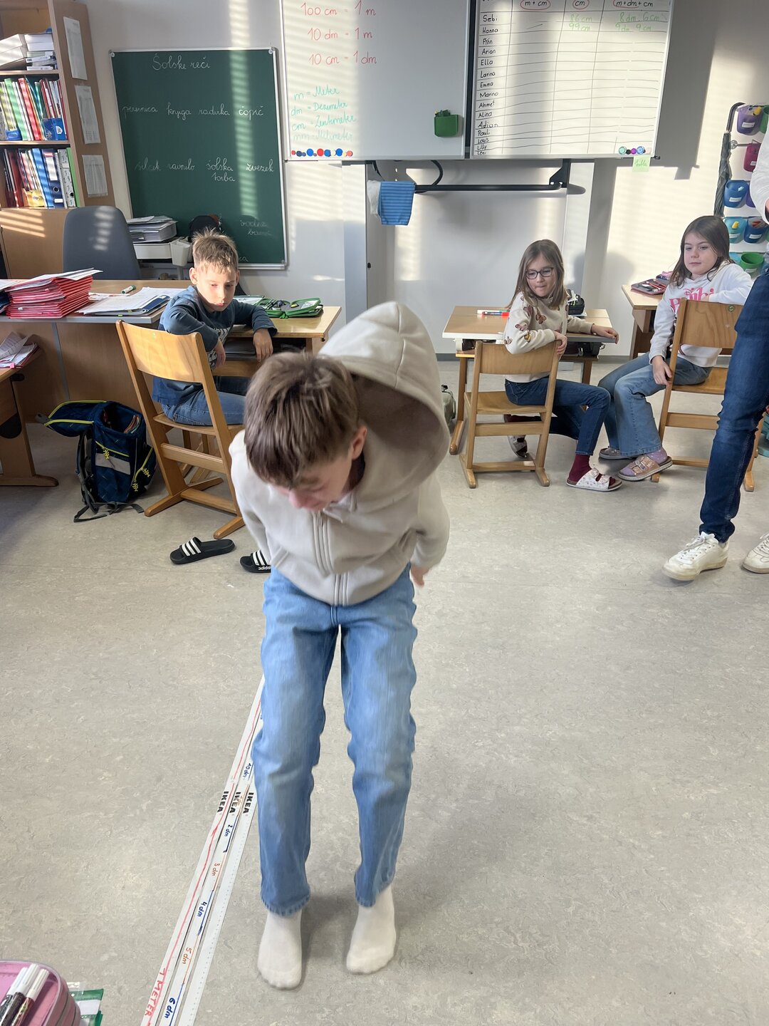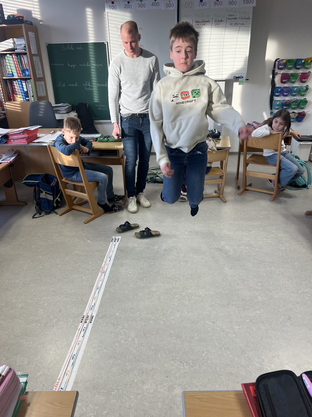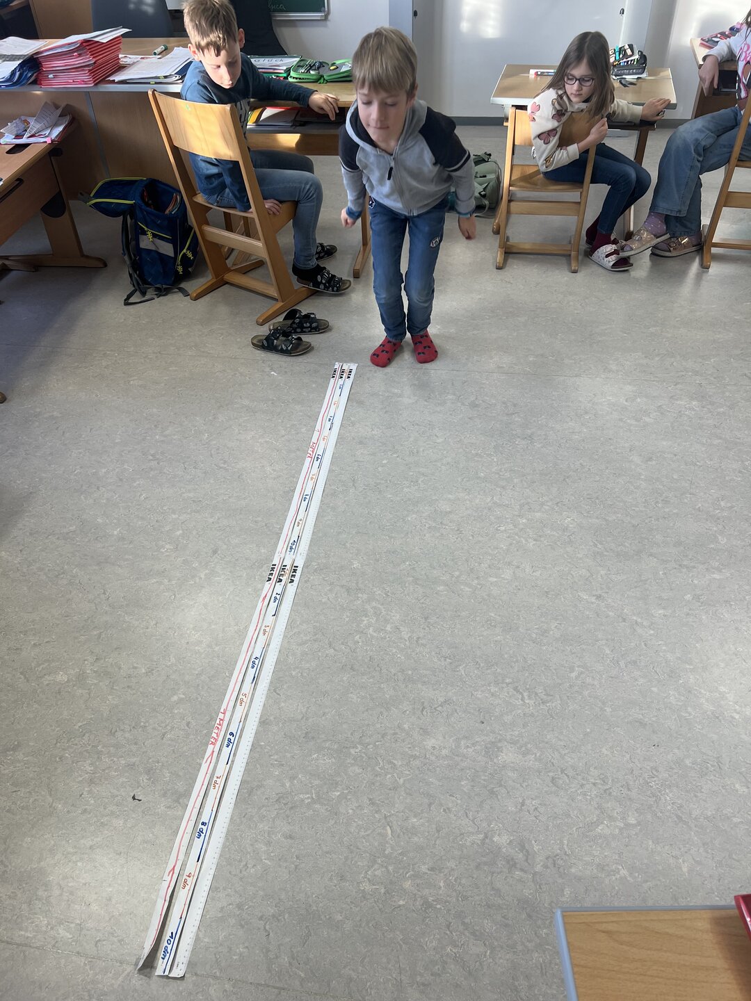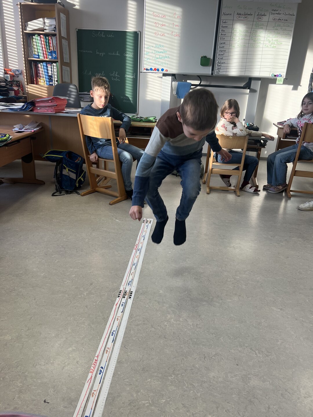 Beim Weitsprung in der Klasse haben die Kinder ihre Ergebnisse direkt selbst gemessen. Das war der perfekte Einstieg, um den Zusammenhang zwischen den verschiedenen Einheiten zu verstehen (Meter, Zentimeter, Millimeter)