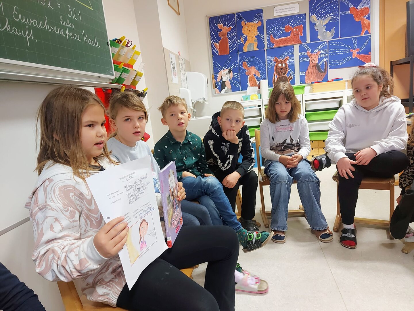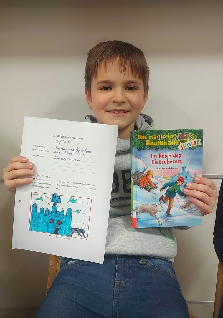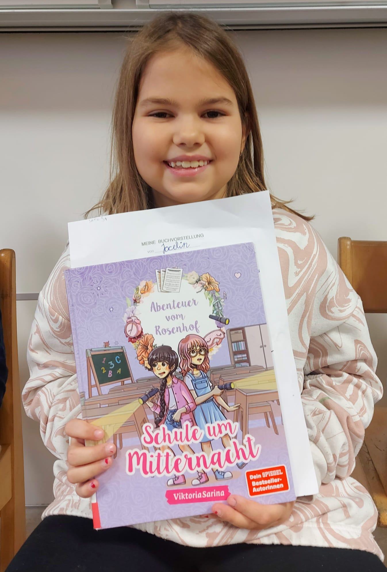 In dieser Woche starteten in der 3C Klasse die ersten Buchvorstellungen: Leonie war die Erste. Sie brachte ein märchenhaftes Buch von einem Jungen mit gelber Nase mit. Jocelin präsentierte ein Buch über eine Nacht in einer Schule, in der wunderliche Dinge passieren. Chiara stellte ein Buch vor, dem eine wahre Geschichte zugrunde liegt: Ein engagiertes Mädchen vermittelt Tiere, die ein Zuhause suchen. Jerome hatte für uns einen spannenden Teil der Buchreihe "Das magische Baumhaus", in dem zwei Kinder auf die Suche nach dem verlorenen Auge eines Zauberers gehen.