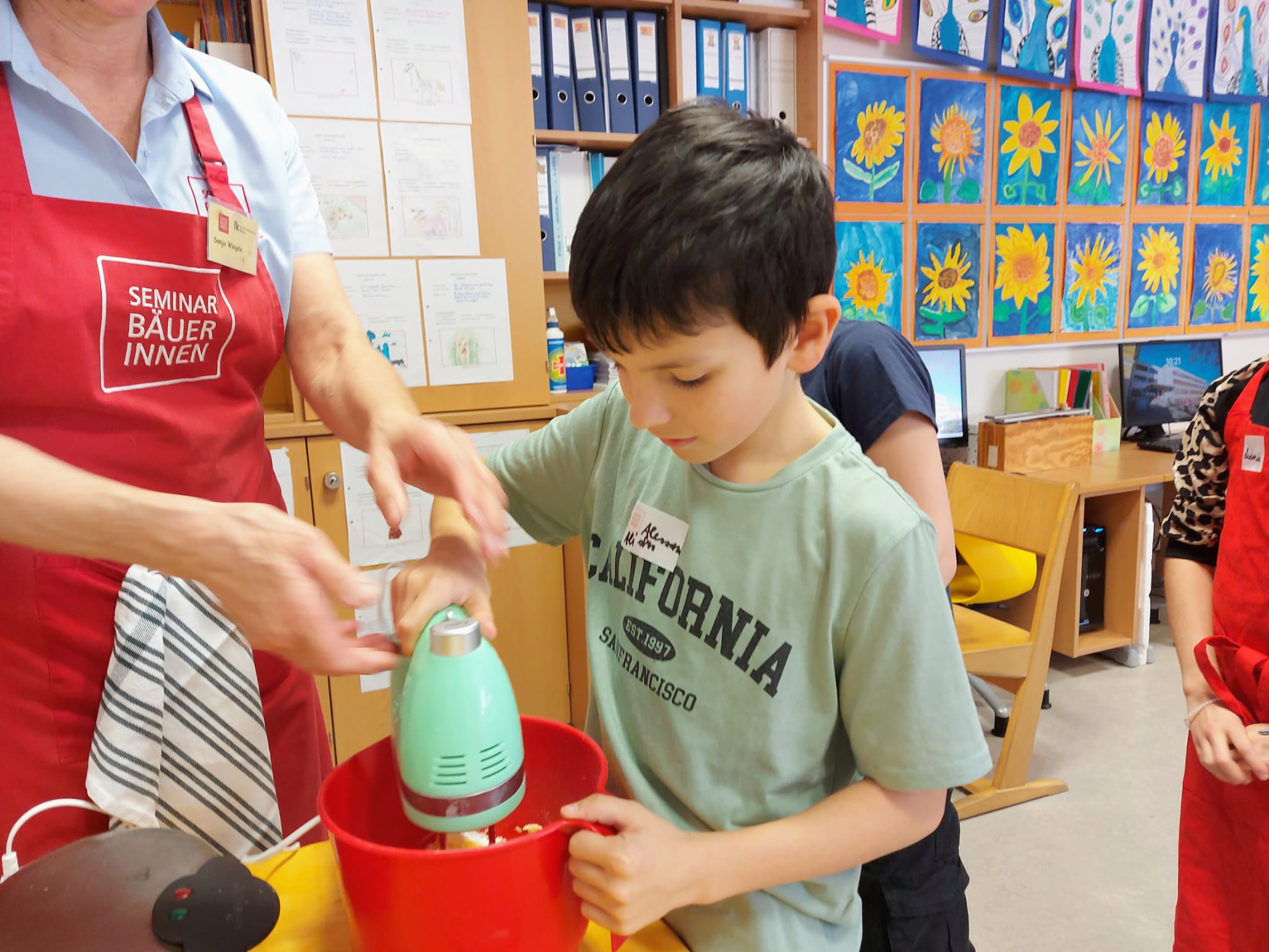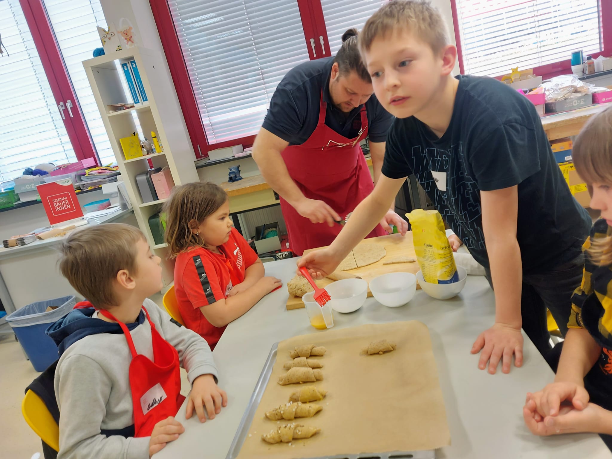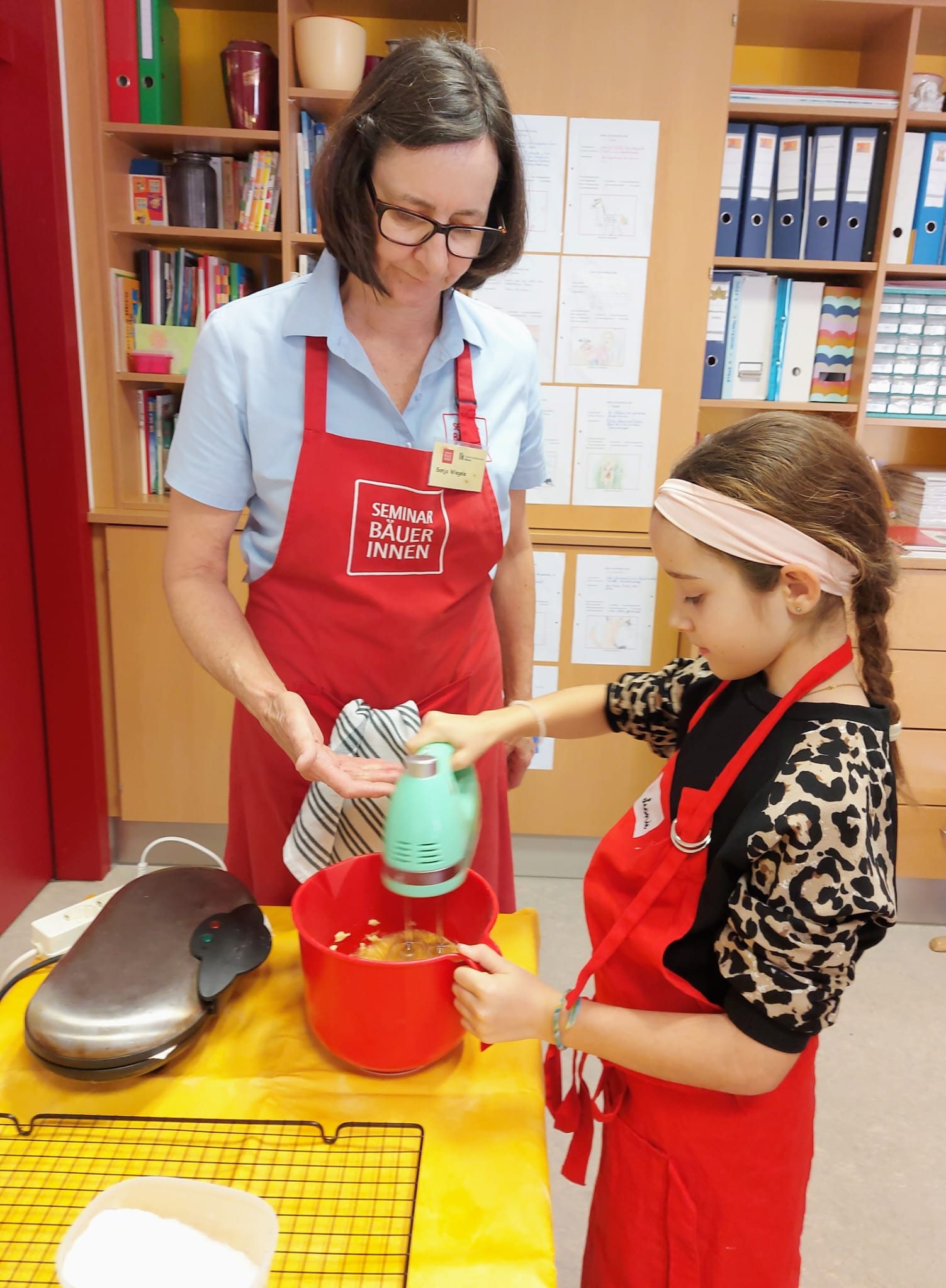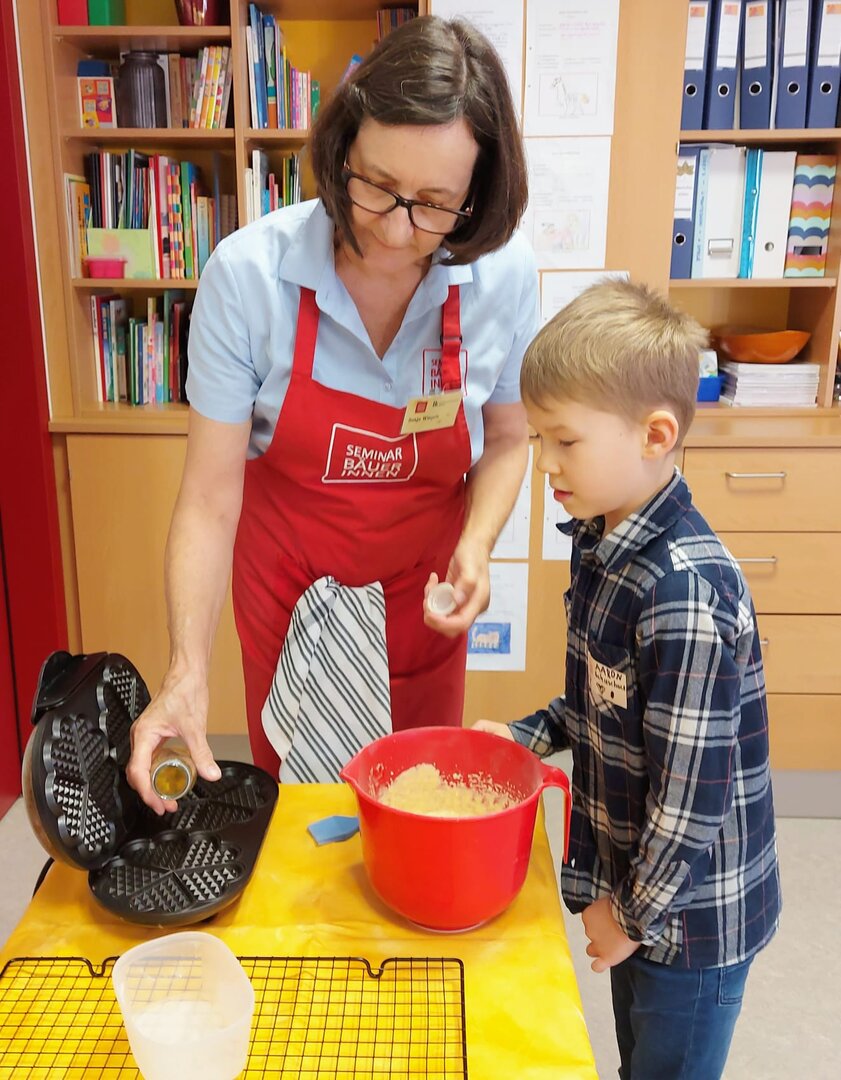 Am Donnerstag durften die Kinder der 3 C Klasse mit Seminarbäuerin Sonja und Seminarbauer Florian einen frischen Salat anrichten, Griessuppe kochen, Salzstangerln backen und süße Waffeln toasten. Nebenbei lernten sie über die Getreidearten, den Aufbau eines Korns und den Wert von Vollkornprodukten.