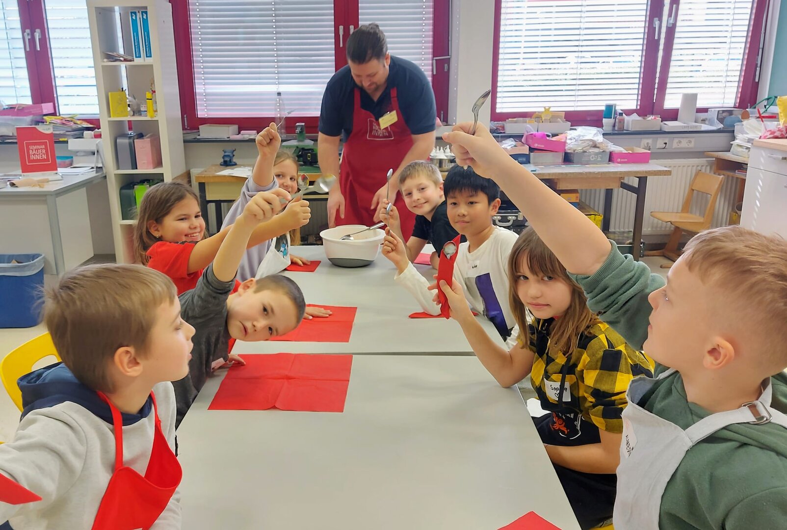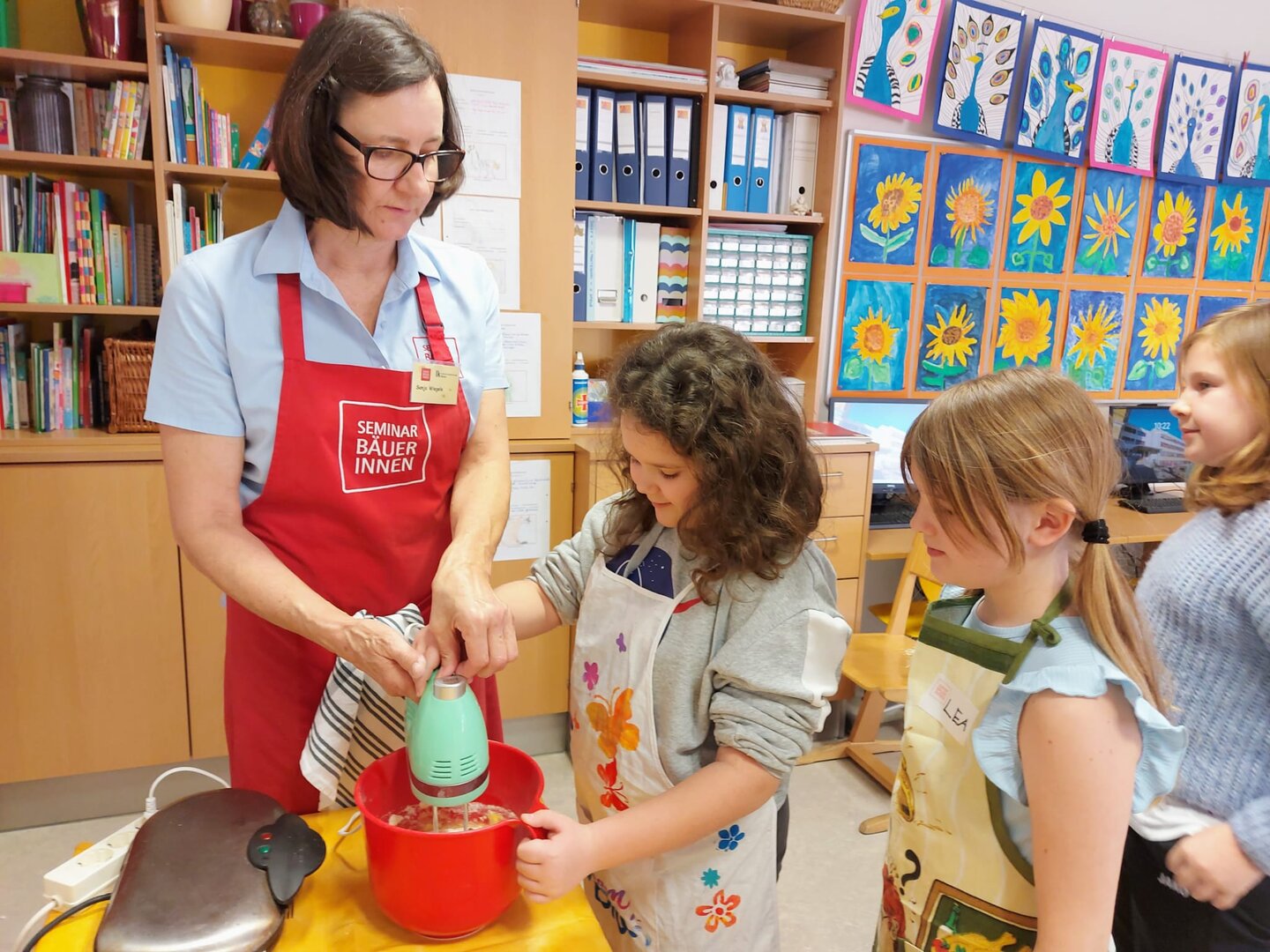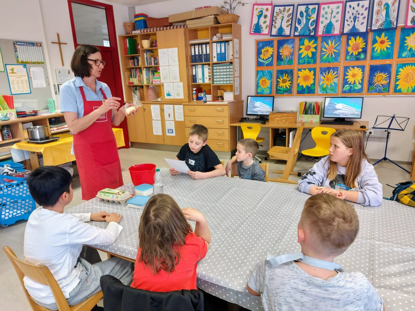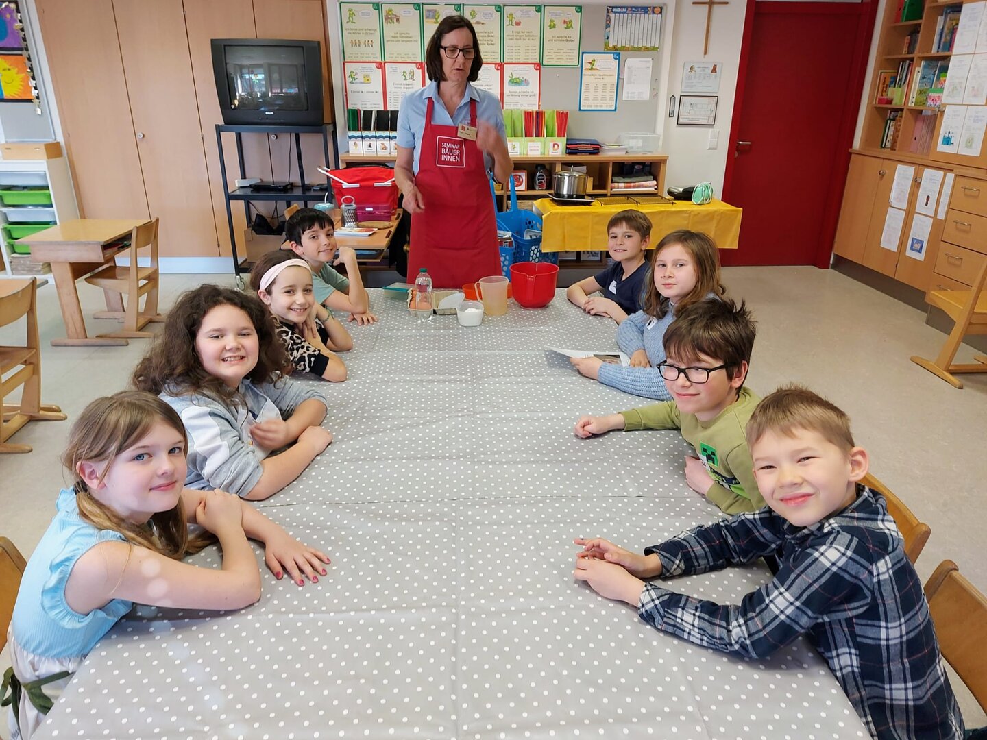 Am Donnerstag durften die Kinder der 3 C Klasse mit Seminarbäuerin Sonja und Seminarbauer Florian einen frischen Salat anrichten, Griessuppe kochen, Salzstangerln backen und süße Waffeln toasten. Nebenbei lernten sie über die Getreidearten, den Aufbau eines Korns und den Wert von Vollkornprodukten.