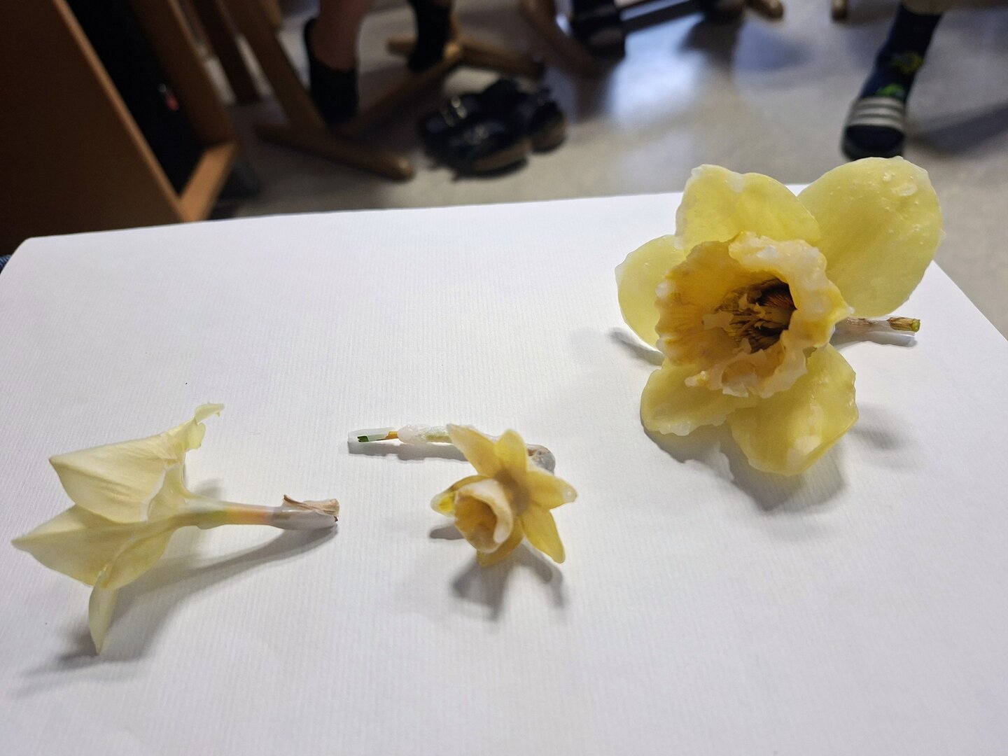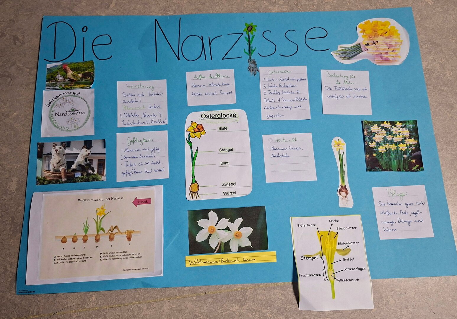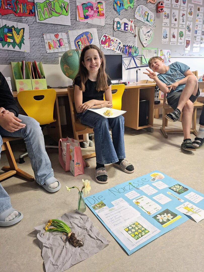 In der 4C haben die Referate der Kinder begonnen. Gestartet ist Leonie mit der Narzisse. Sie hat ein wunderschönes Plakat gestaltet, Narzissen aus dem Garten mitgebracht, eine Pflanze ausgegraben, um alle Teile zu zeigen, und sogar Blüten in Wachs getaucht, damit wir diese länger betrachten können.