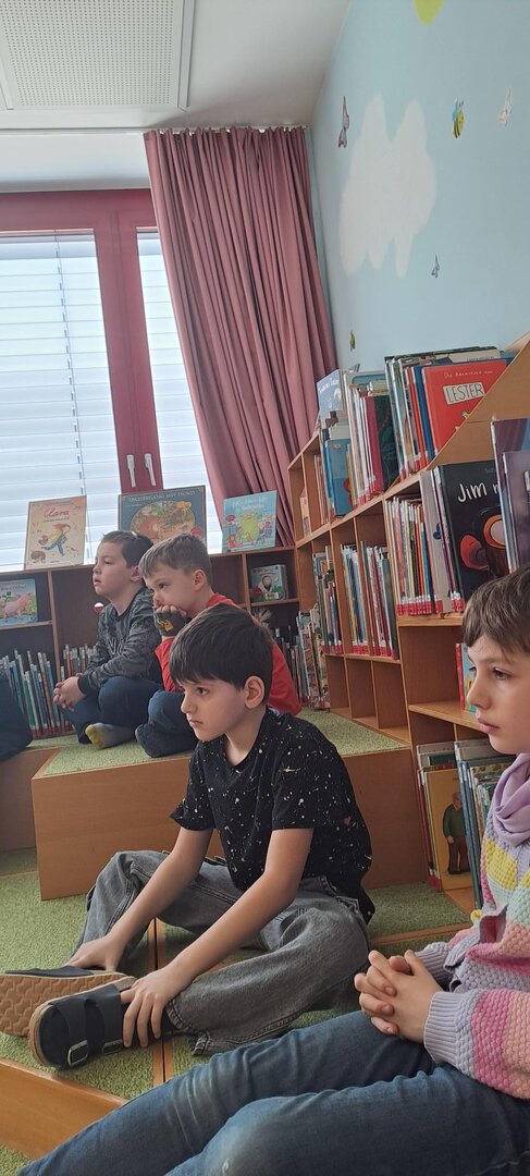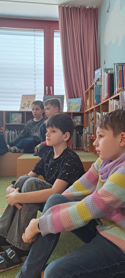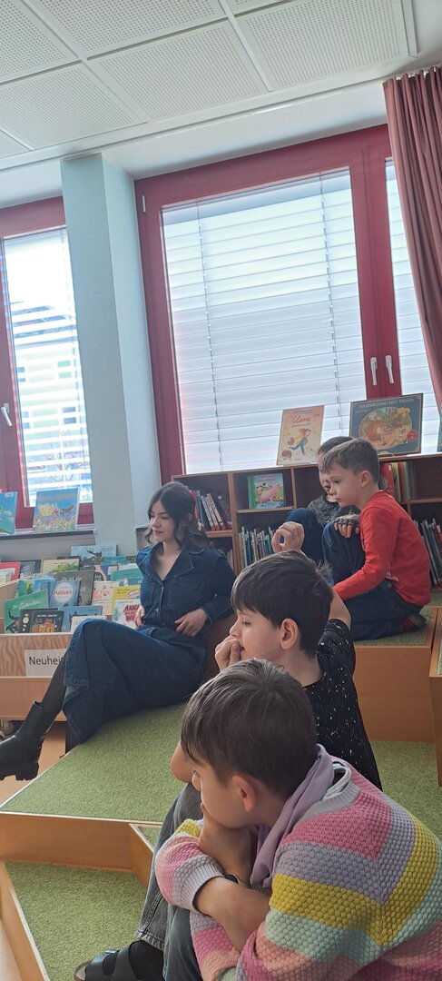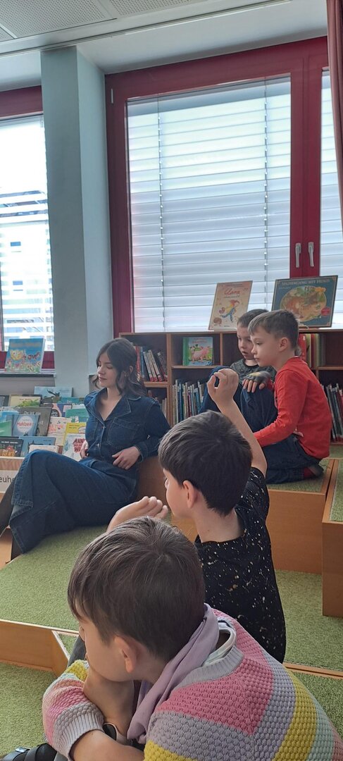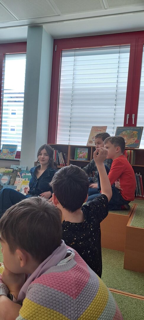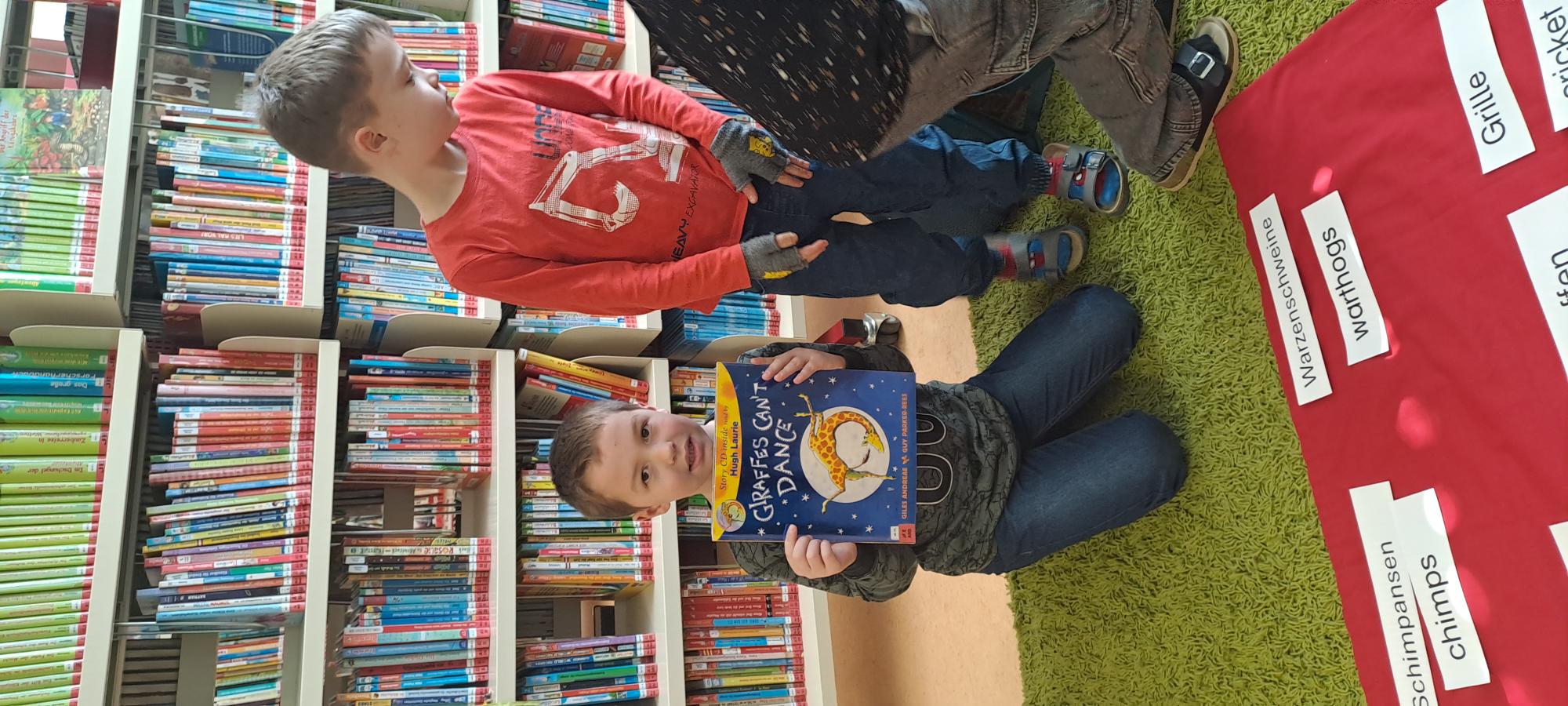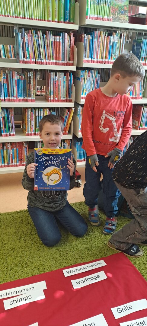 Frau Rapold stellt das englische Kinderbuch "Giraffs can't dance" von Hugh Laurie vor. Die Schüler lauschten gespannt der Geschichte, die in englischer Sprache vorgetragen wurde.