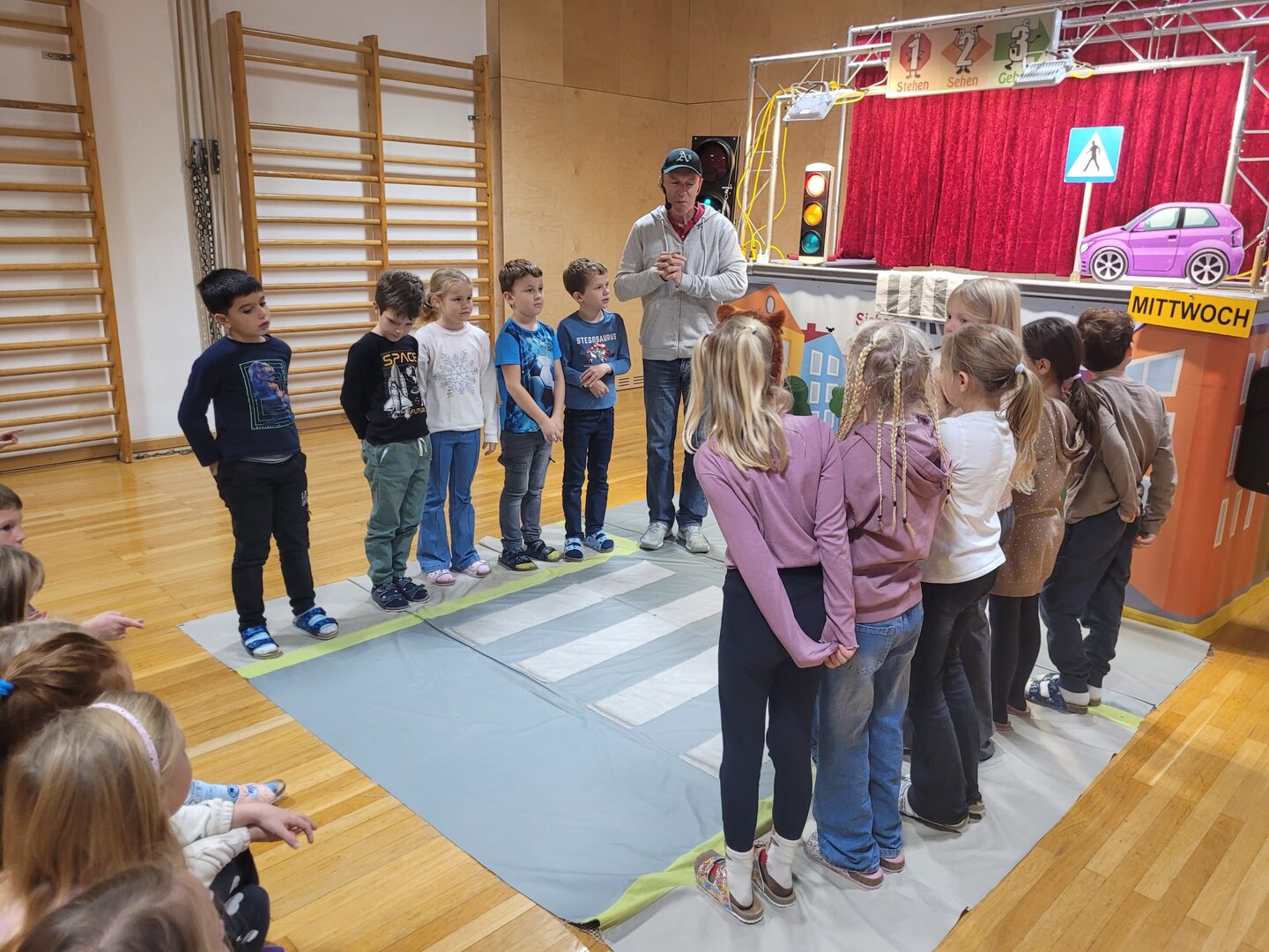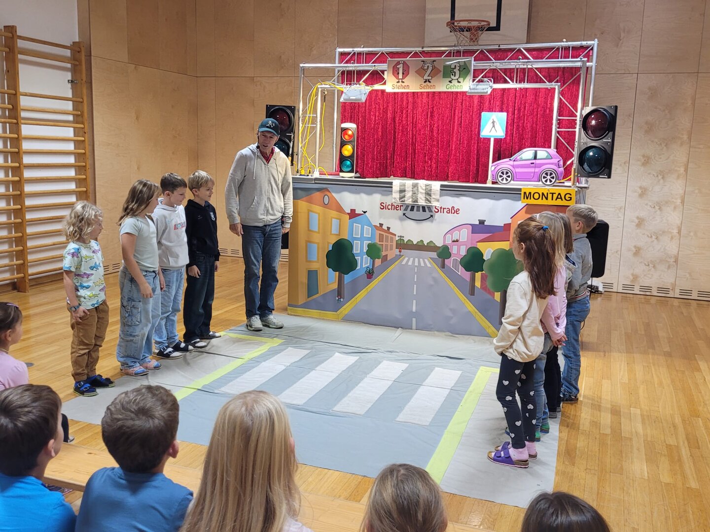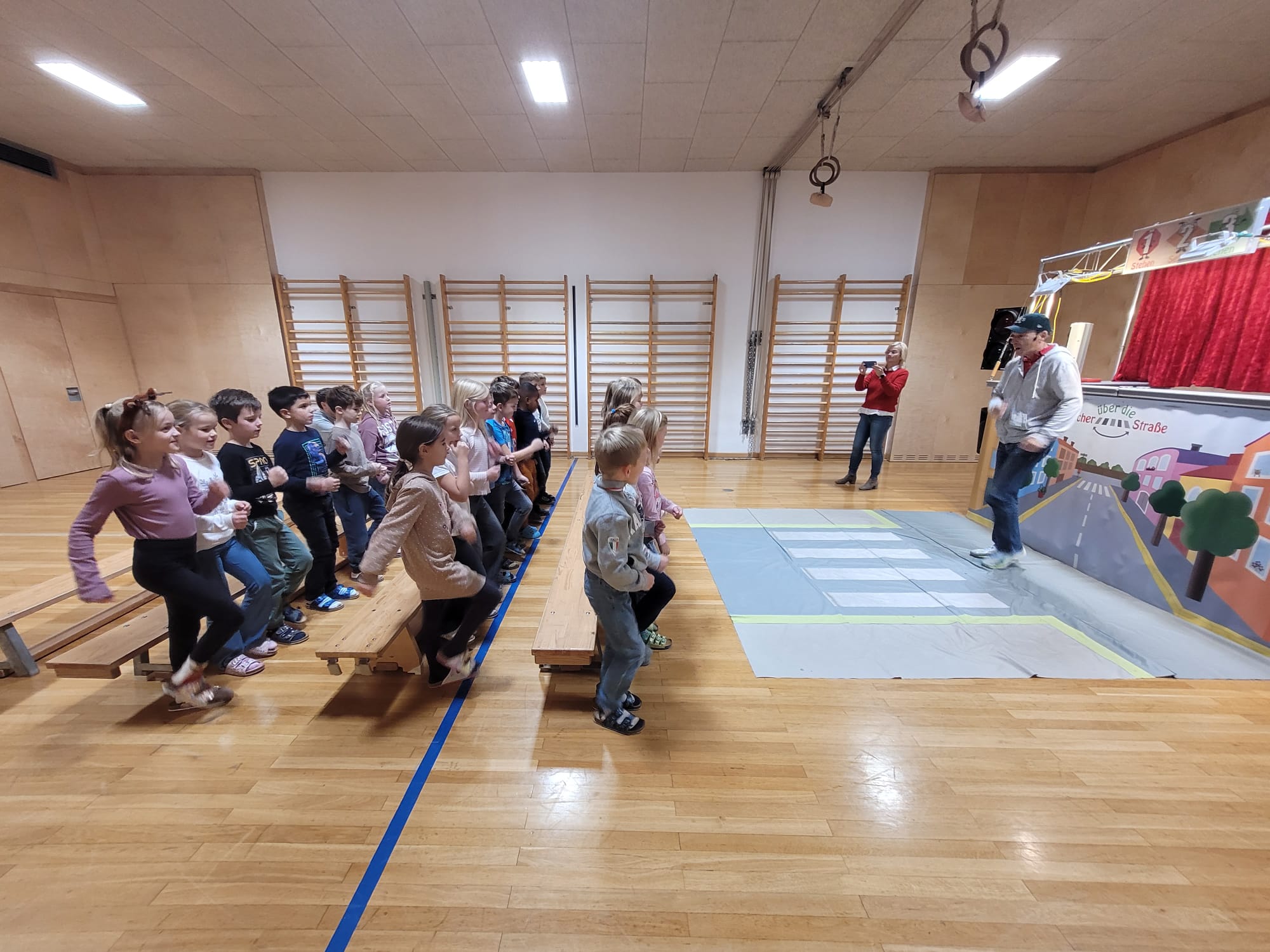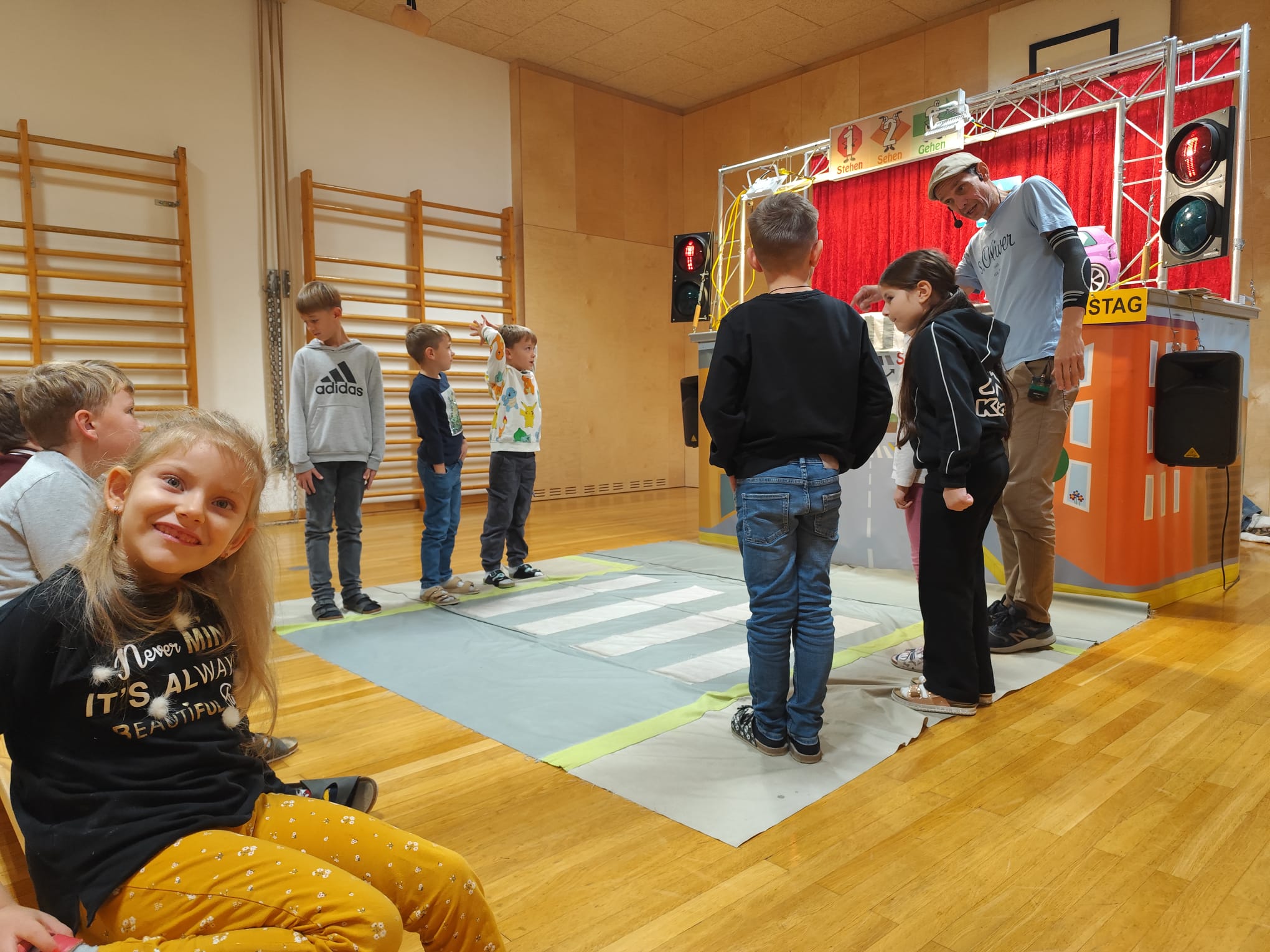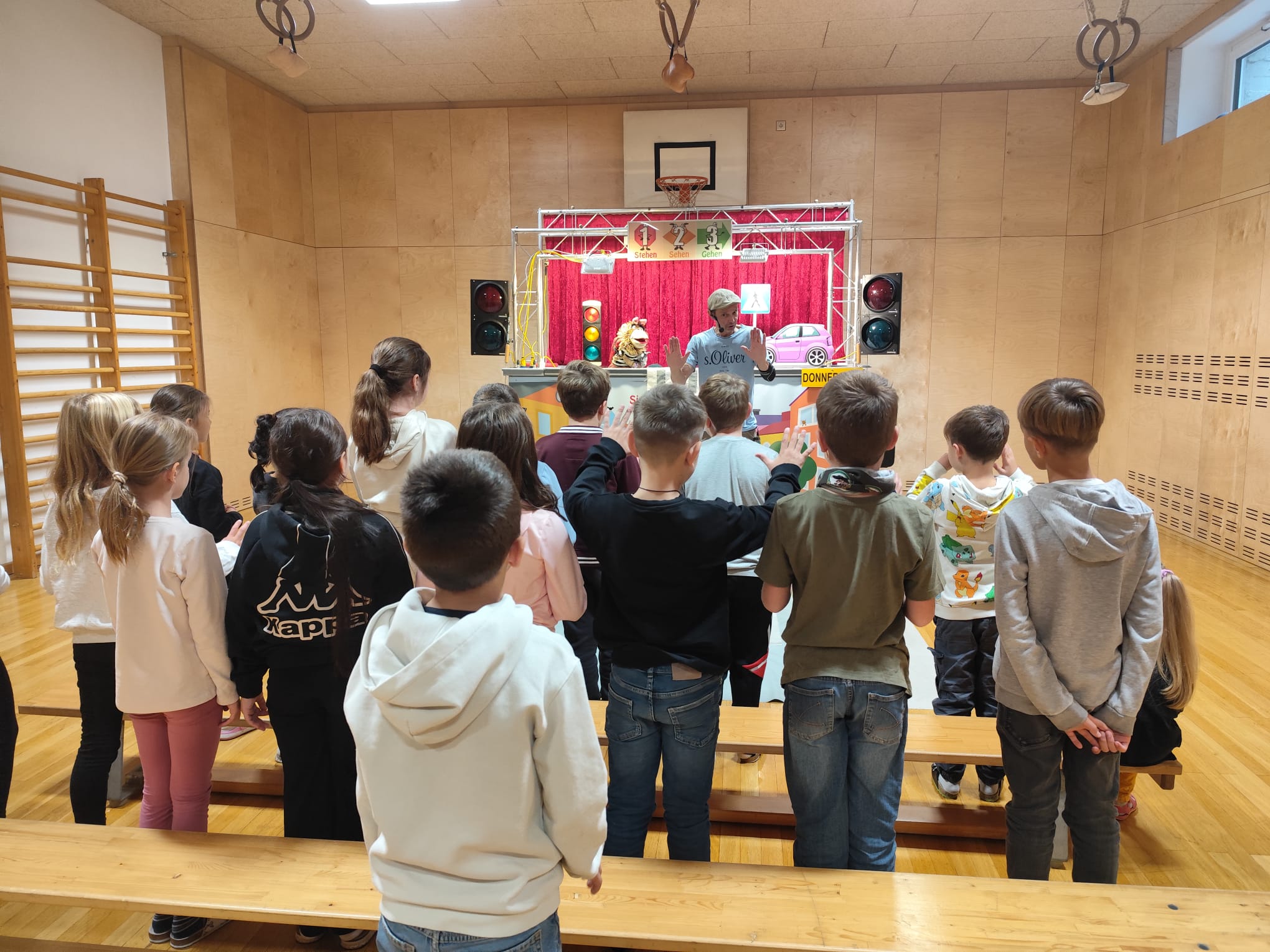 Unsere Schülerinnen und Schüler haben eine wichtige Zauberformel für das Überqueren der Straße gelernt: stehen – sehen – gehen. Mit dieser einfachen Regel üben die Kinder, sicher und aufmerksam über die Straße zu kommen – auch auf ihrem Schulweg.
