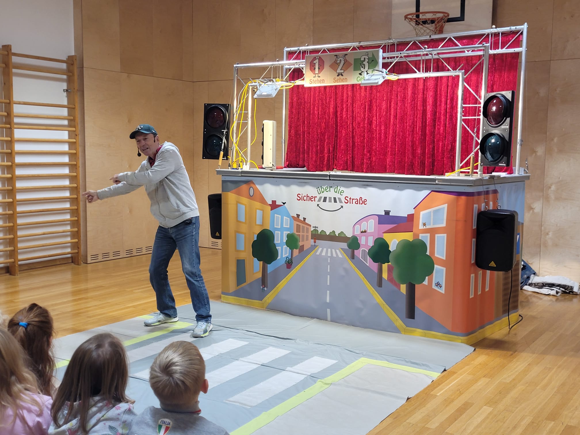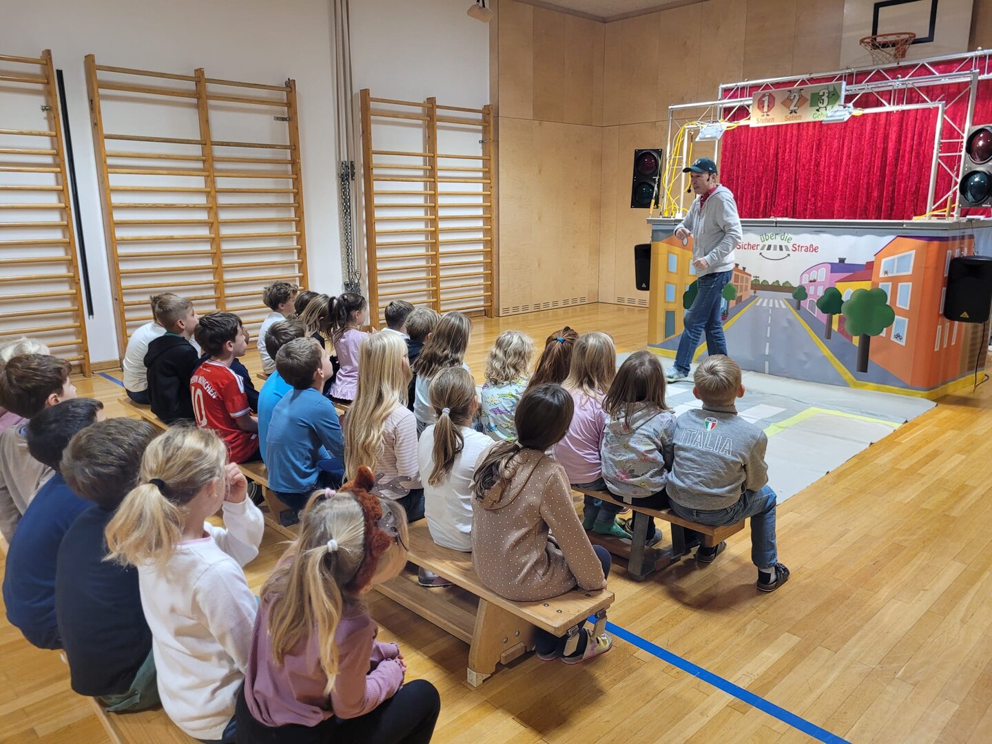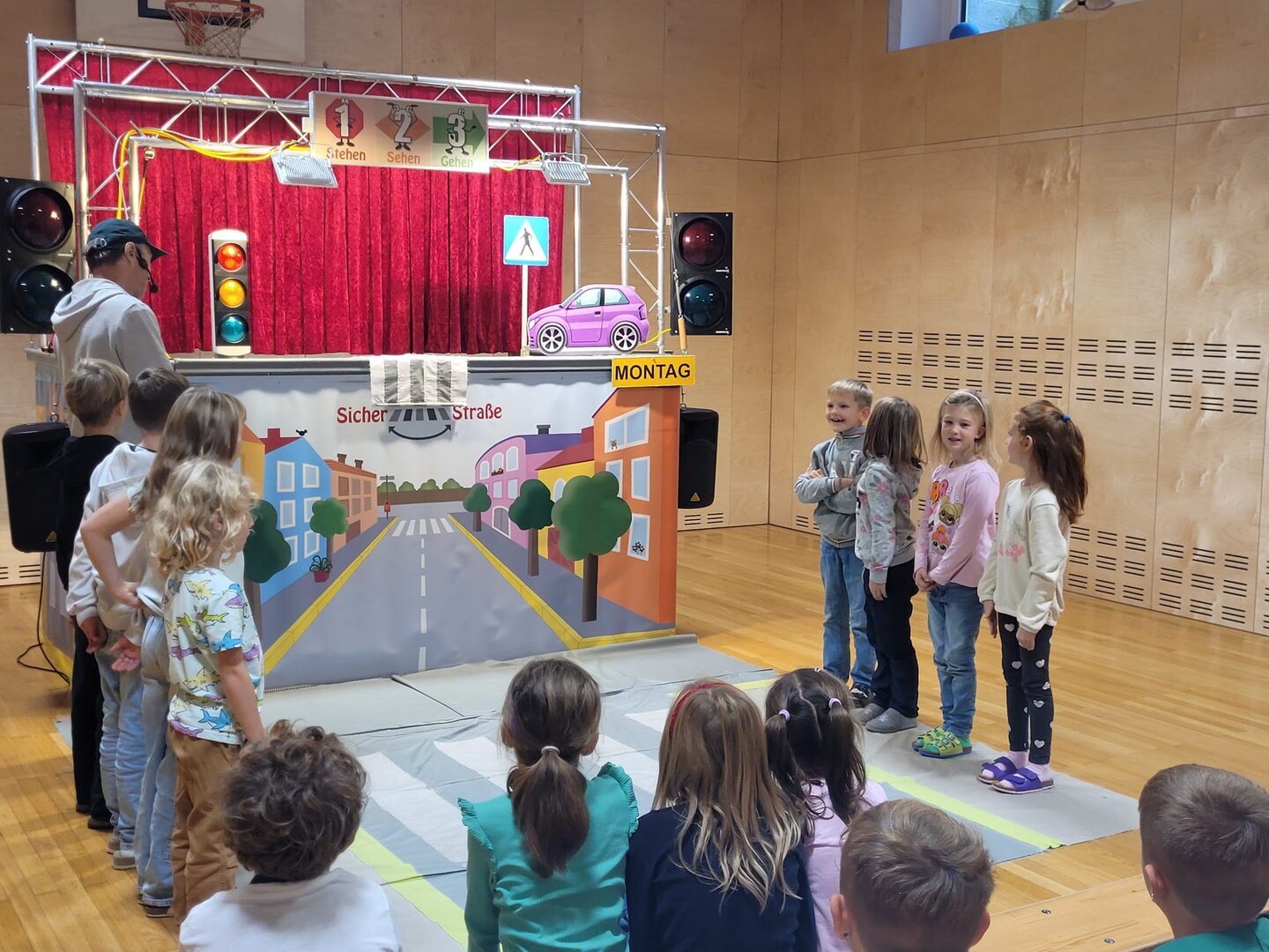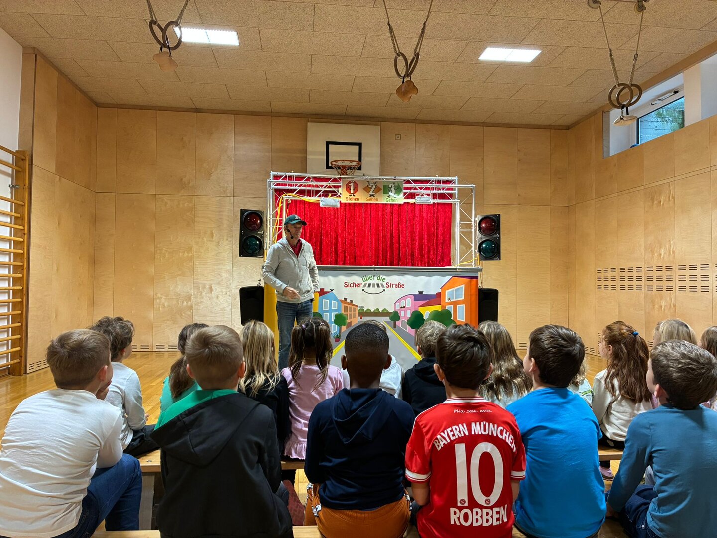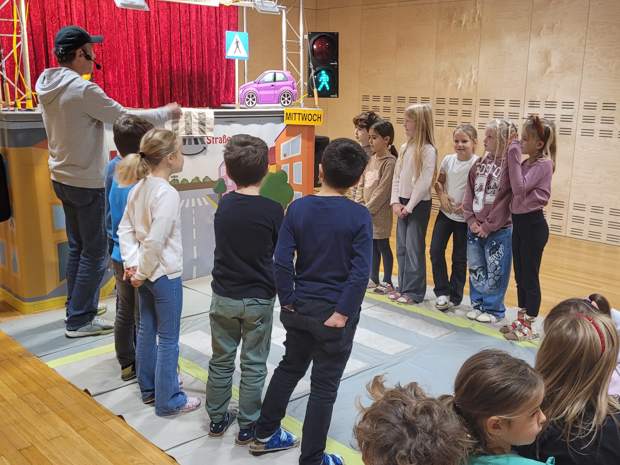 Unsere Schülerinnen und Schüler haben eine wichtige Zauberformel für das Überqueren der Straße gelernt: stehen – sehen – gehen. Mit dieser einfachen Regel üben die Kinder, sicher und aufmerksam über die Straße zu kommen – auch auf ihrem Schulweg.